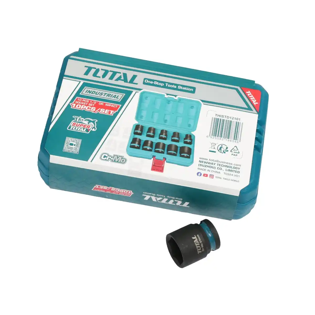 Total THISTD12101, havalı (pnömatik), elektrikli veya şarjlı darbeli somun sıkma makineleriyle kullanılmak üzere geliştirilmiş 10 parçalık bir profesyonel lokma takımıdır. 1/2" standart sürücü girişine sahip olan bu set, standart krom-vanadyum lokmaların çatlayabileceği yüksek torklu ve ani darbeli işlemlerde güvenli bir çalışma ortamı sağlar.