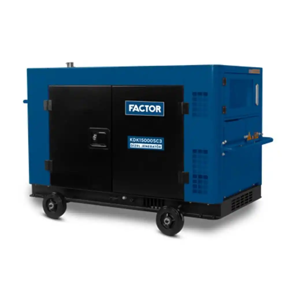 Factor KDK15000SC3, 15 kVA güç kapasitesine sahip, çift silindirli hava soğutmalı dizel motorla çalışan ve üç fazlı (trifaze) elektrik üreten kabinli bir yedek güç sistemidir.