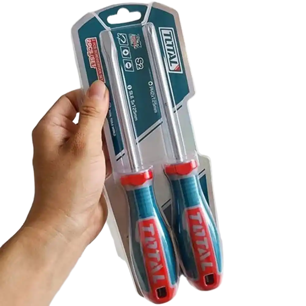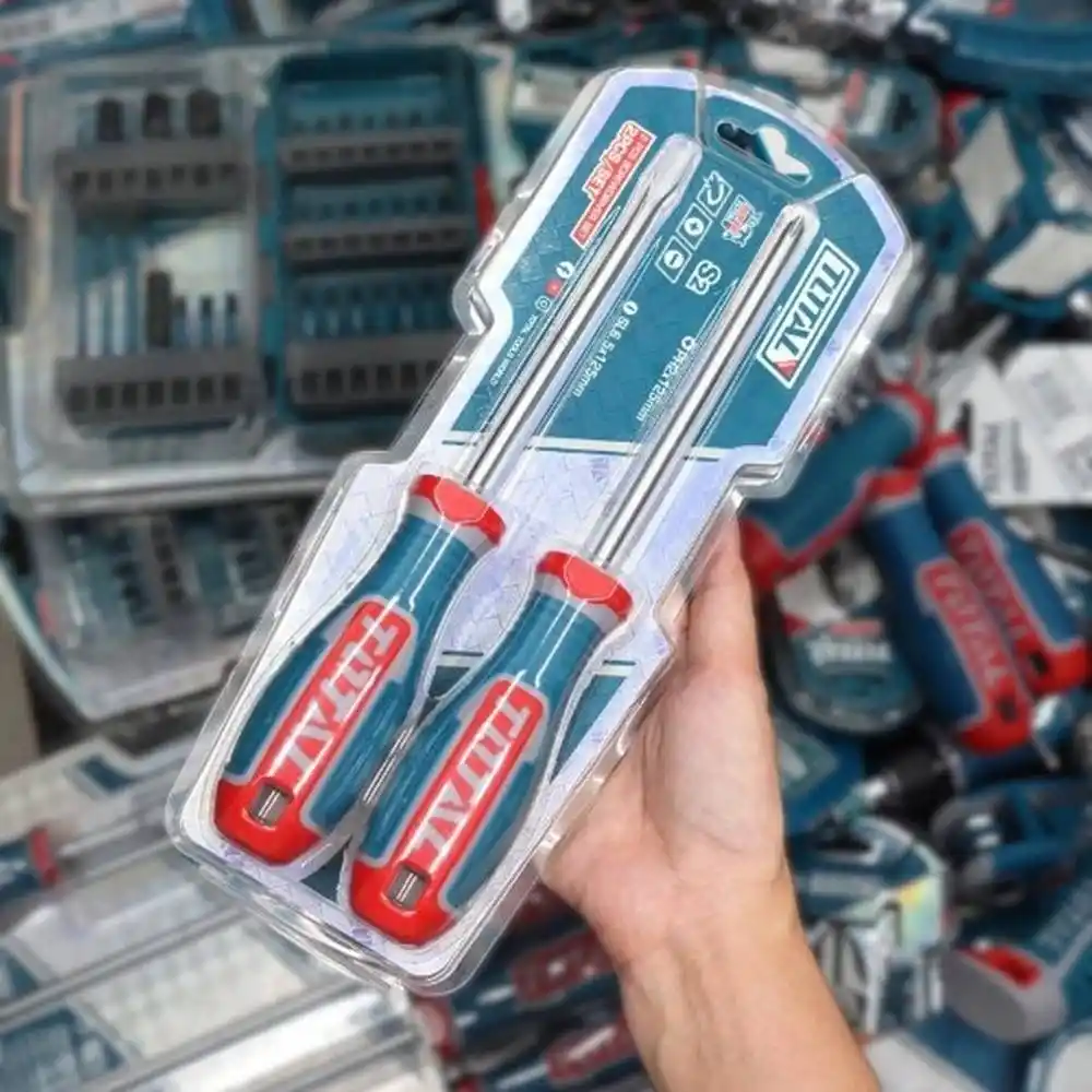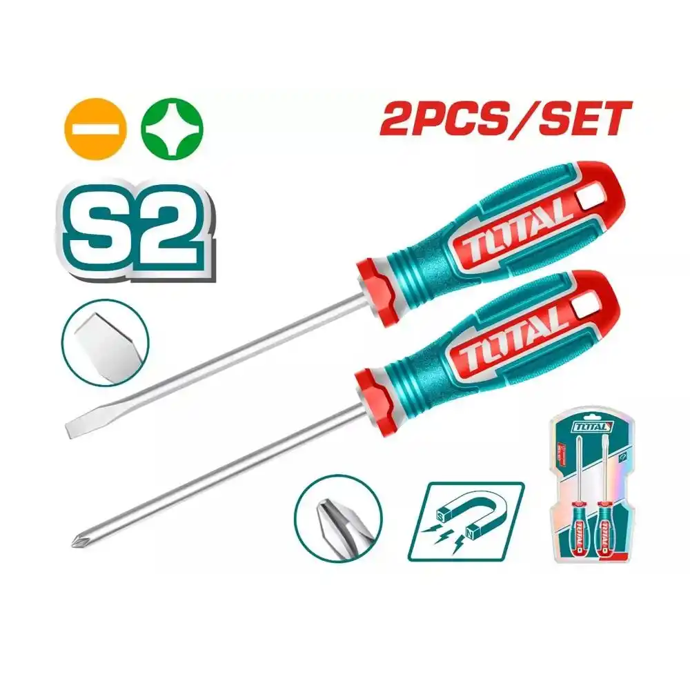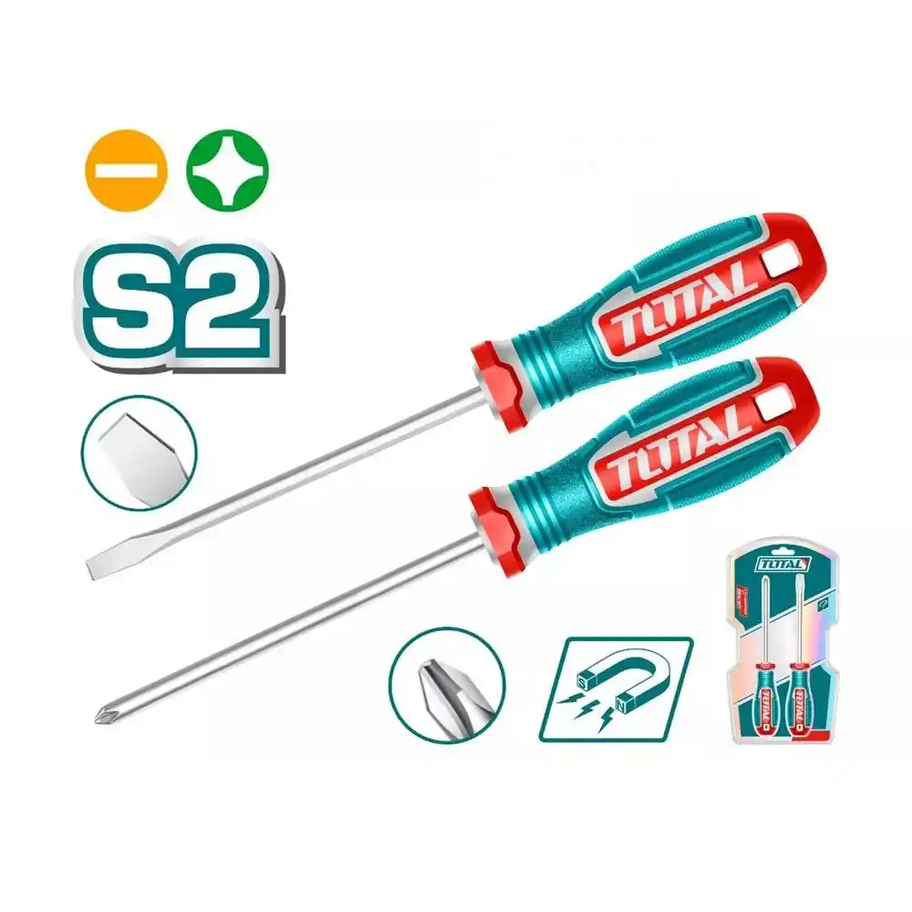Total TKSDS0226, endüstriyel sınıf S2 çelikten üretilmiş, bir adet yıldız (PH2) ve bir adet düz (SL6.0) tornavidadan oluşan, yüksek tork direnci sağlayan profesyonel bir el aleti setidir.
