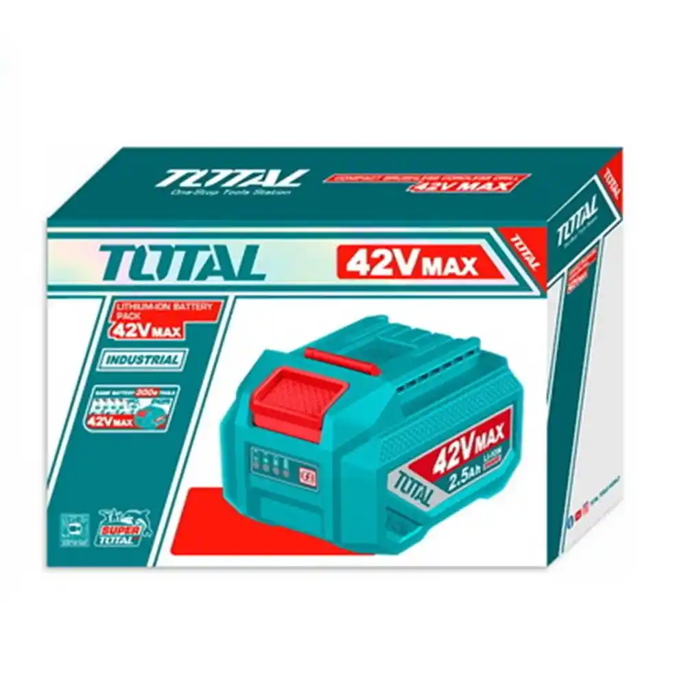Total TFBLI42251E; 42V endüstriyel platformdaki kablosuz el aletlerine enerji sağlayan, yüksek yoğunluklu lityum-iyon hücre yapısına sahip, 2.5 Amper-saat kapasiteli profesyonel bir yedek güç ünitesidir.