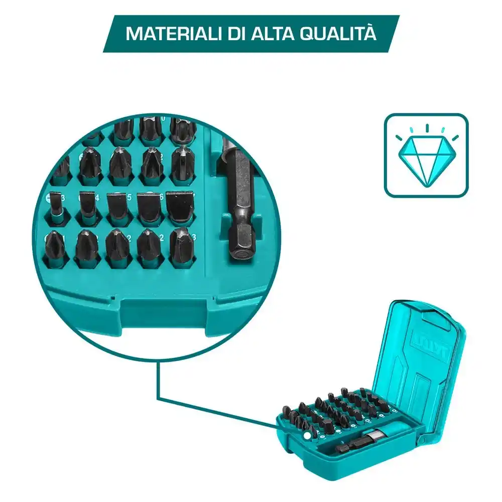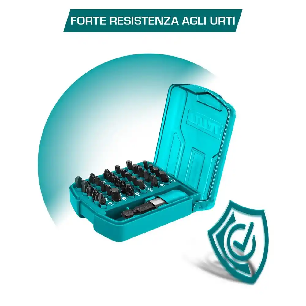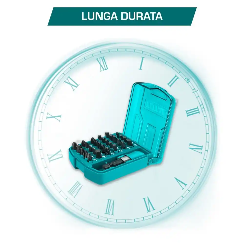 Total TACSD18306; darbeli vidalama makinelerinin yüksek tork gücüne dayanacak şekilde S2 kalite alaşımlı çelikten üretilmiş, 25 mm uzunluğunda 30 farklı ucu kapsayan profesyonel bir aksesuardır.
