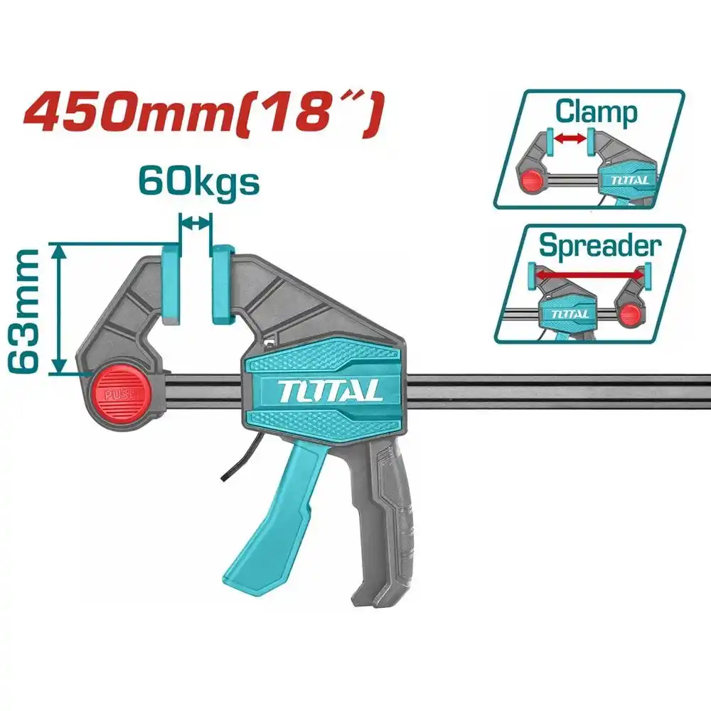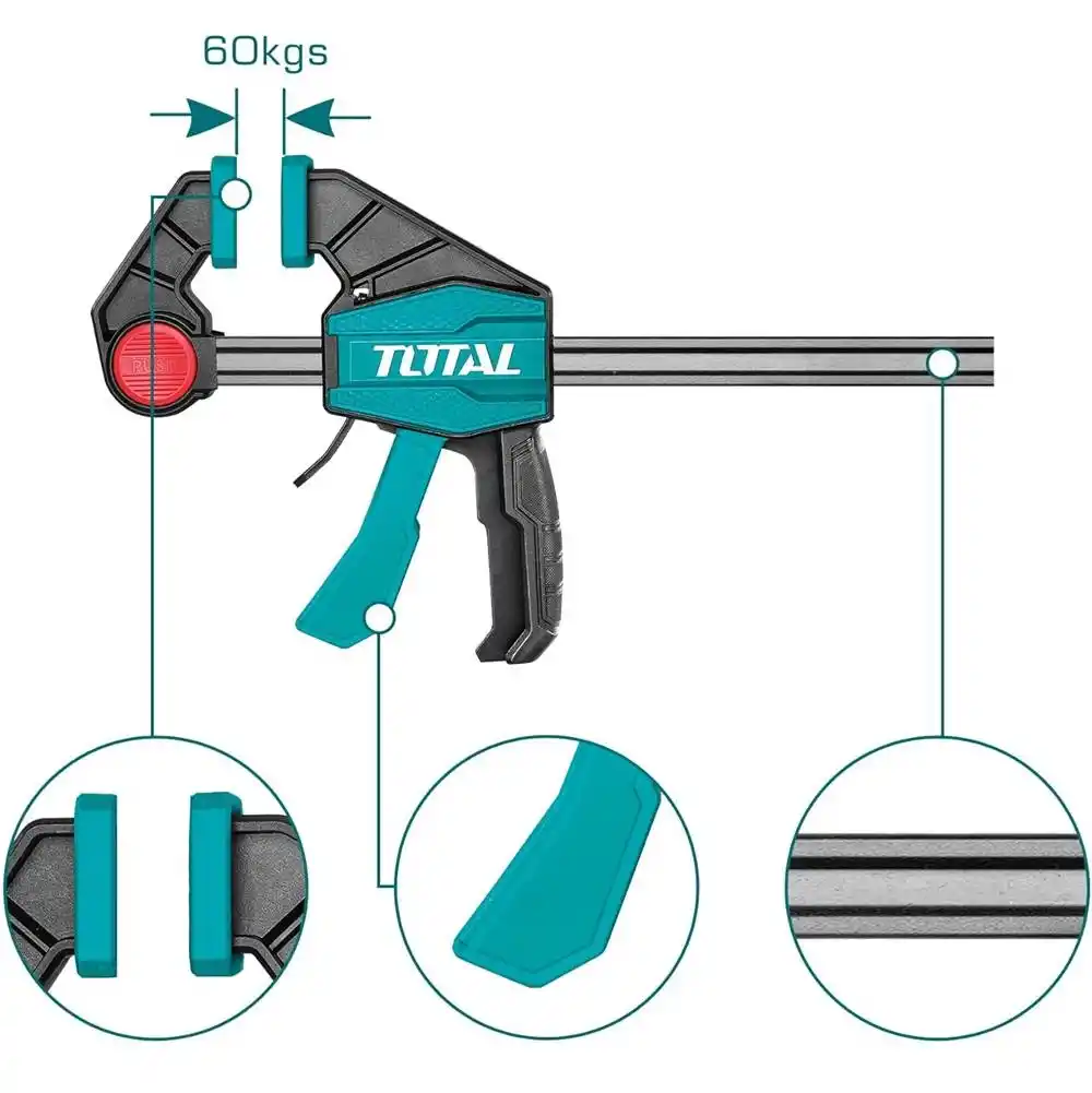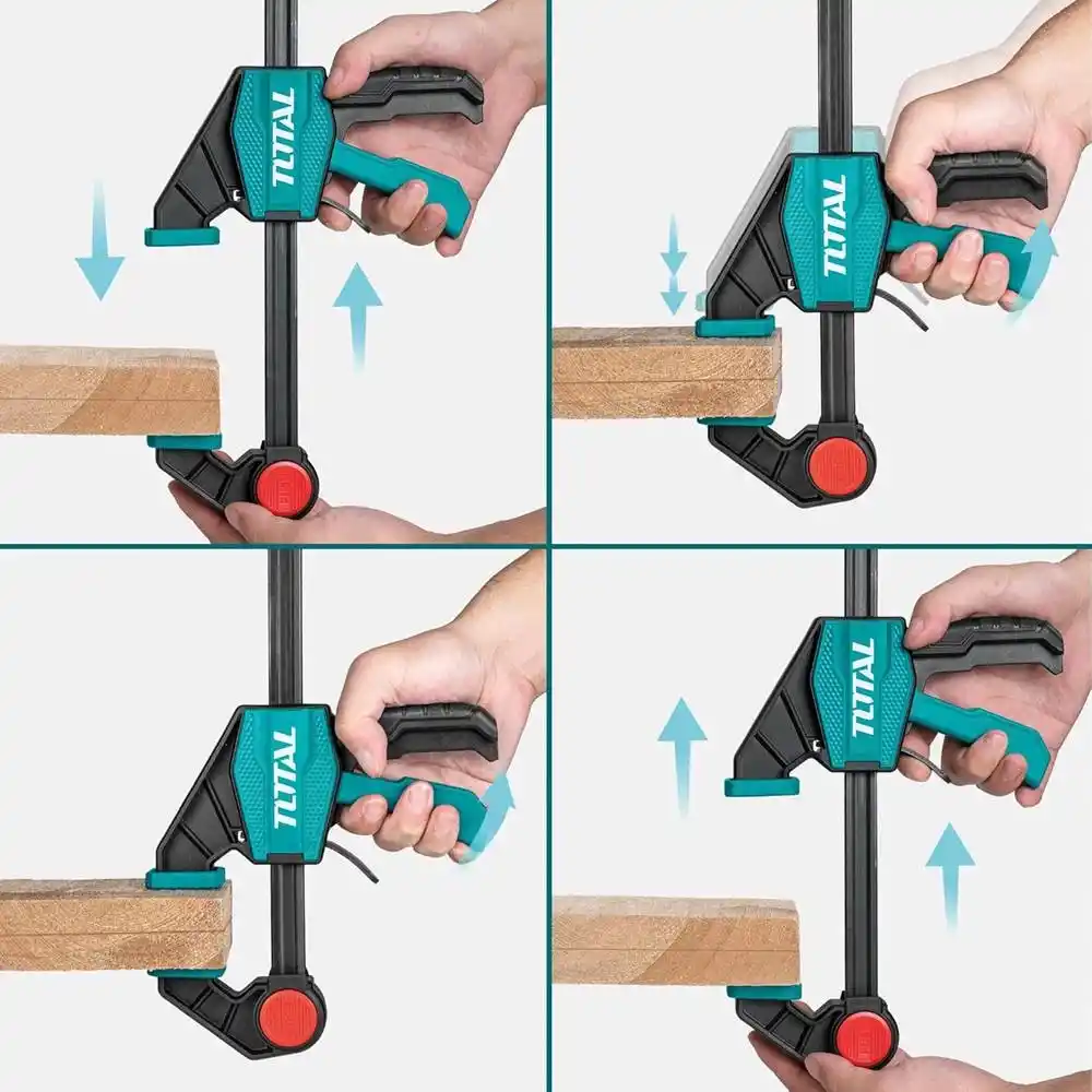 Total THT1340603; iş parçalarını sabitlemek veya birbirinden uzaklaştırmak (gerdirme) amacıyla kullanılan, tek elle operasyona izin veren cırcırlı bir tetik mekanizmasına sahip profesyonel marangoz işkencesidir.