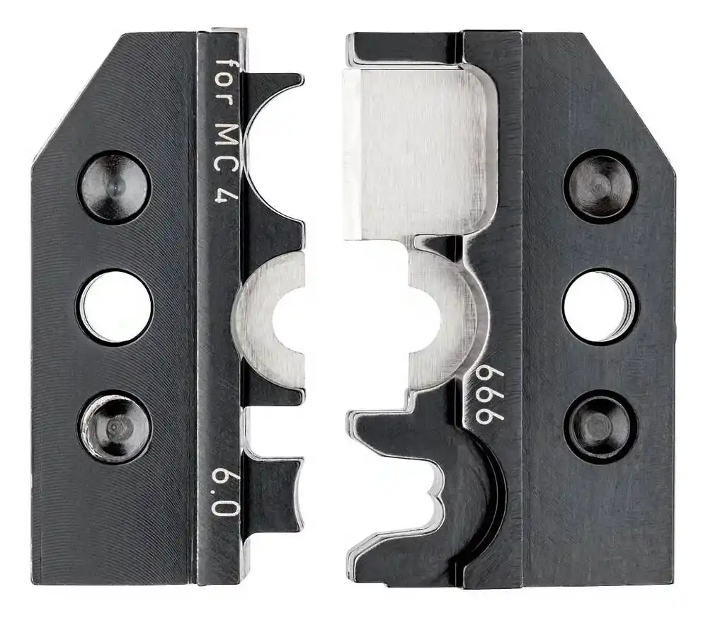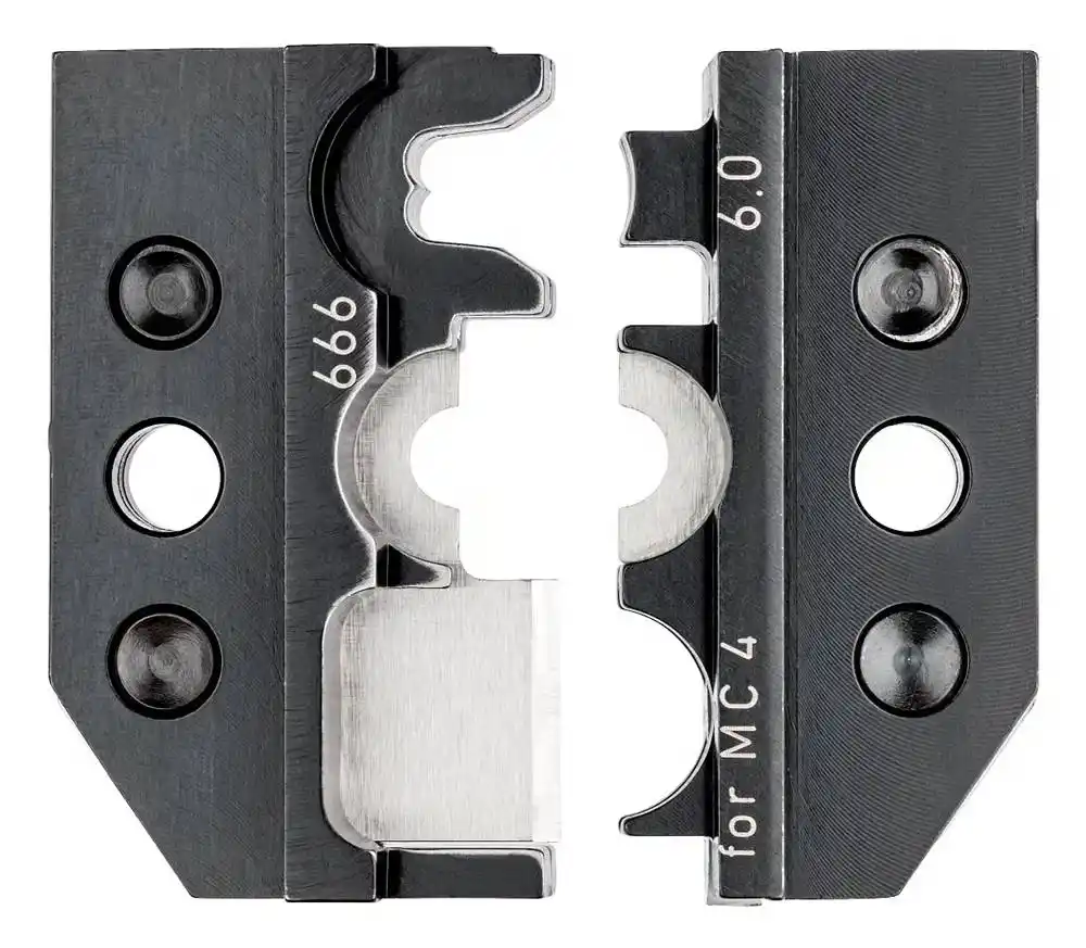 Knipex 97 49 66 6, güneş enerjisi sistemlerinde kullanılan MC4 ve yeni nesil MC4 Evo 2 konnektörlerin, 4-10 mm² kablo kesitlerine endüstriyel standartlarda sabitlenmesini sağlayan değiştirilebilir bir sıkıştırma kalıbıdır.