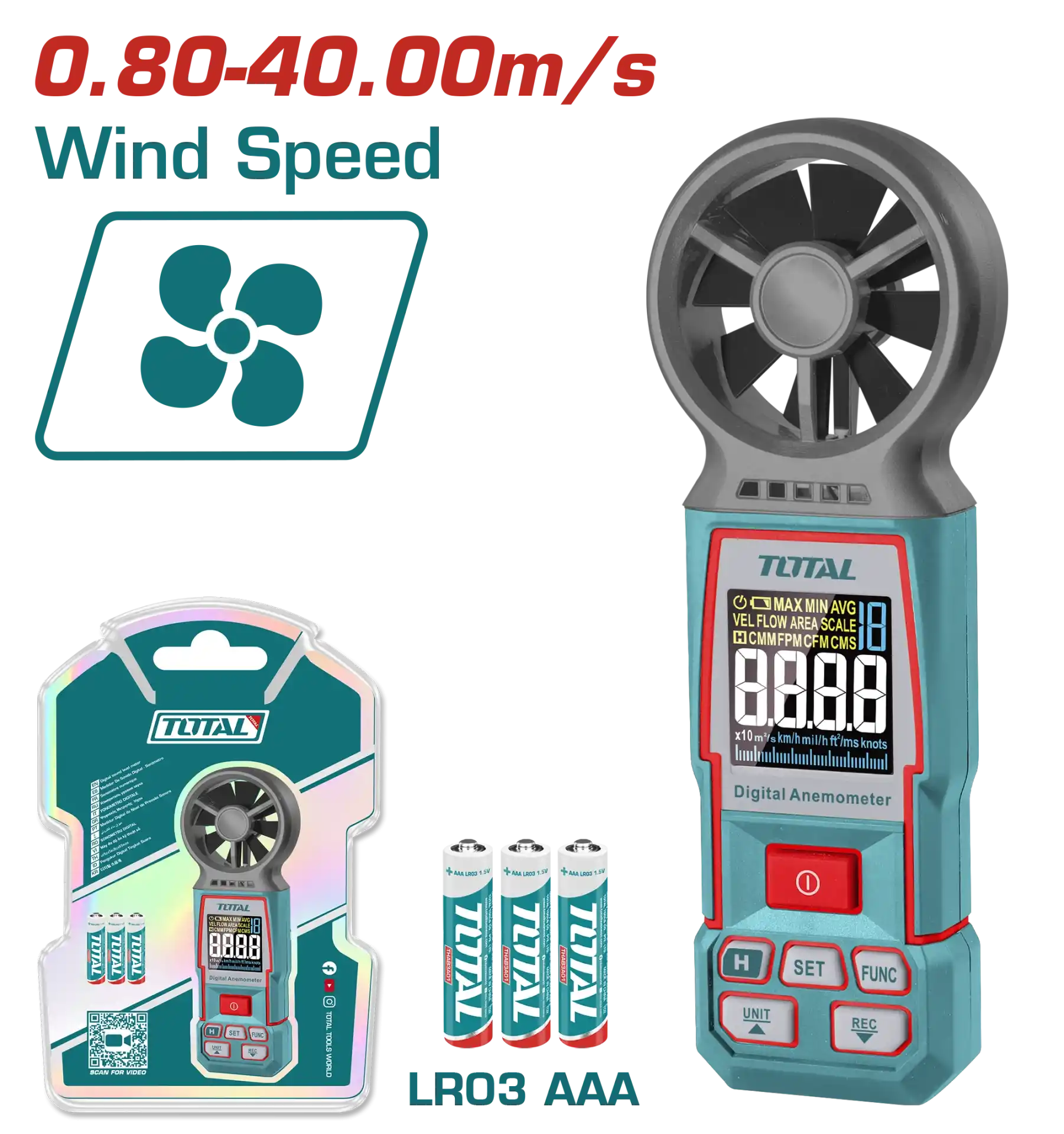 Bu yüksek hassasiyetli Total TETAN031 dijital anemometre, 0,80 ila 40,00 m/sn geniş bir aralık ve 0,01 m/sn ±(%2,0+30) hassas çözünürlükle hassas hava hızı ölçümü için tasarlanmıştır. İster HVAC sistemlerinde, ister dış mekan uygulamalarında veya çevre testlerinde kullanılsın, bu cihaz her zaman güvenilir sonuçlar sunar. Karanlık ortamlarda görünürlük sağlayan parlak arka aydınlatma, okumaları dondurmak için veri tutma işlevi ve sürekli kullanım için düşük pil göstergesi gibi özellikleri bulunur. 3 adet AAA pil ile birlikte gelir ve güvenli bir çift blister ambalajda paketlenmiştir.