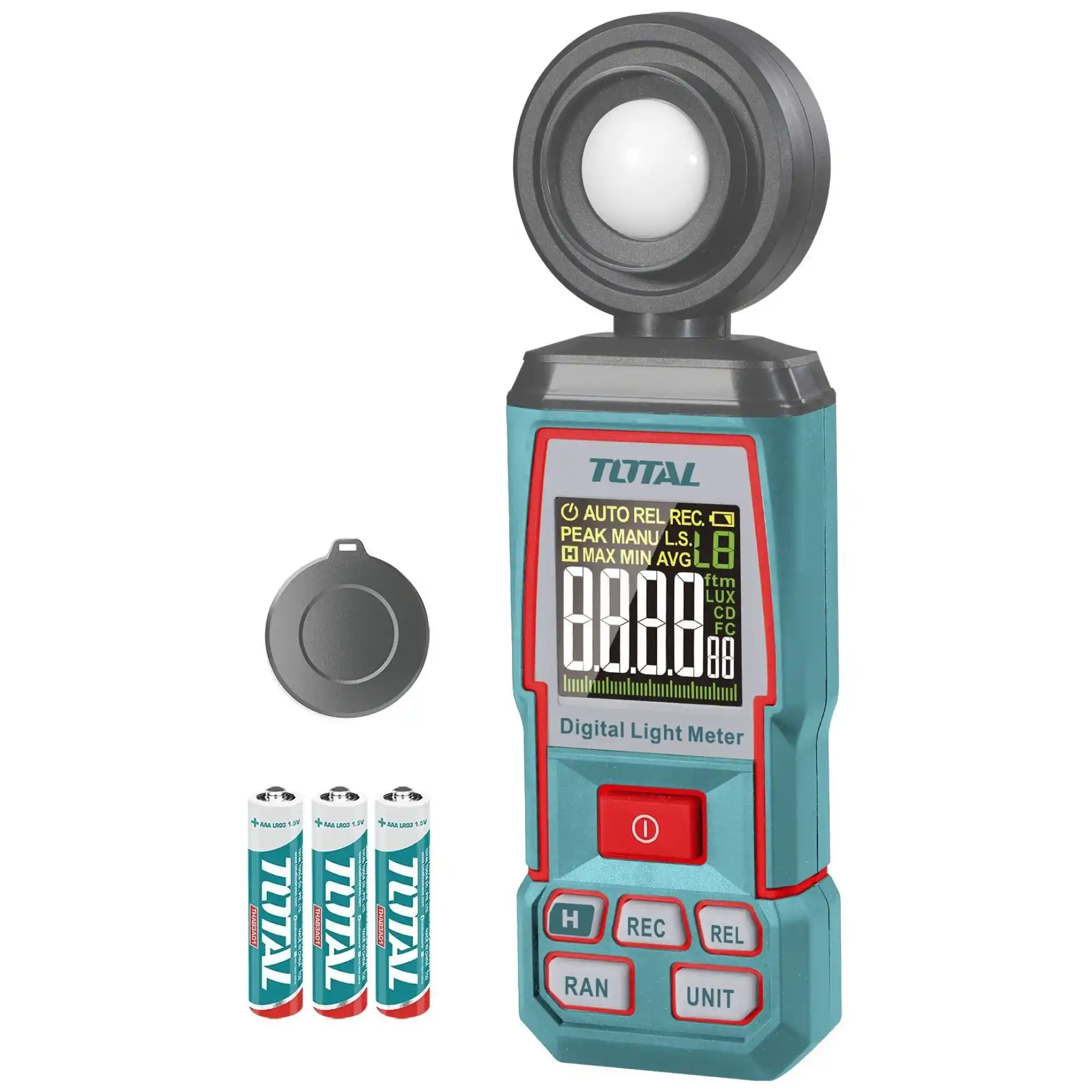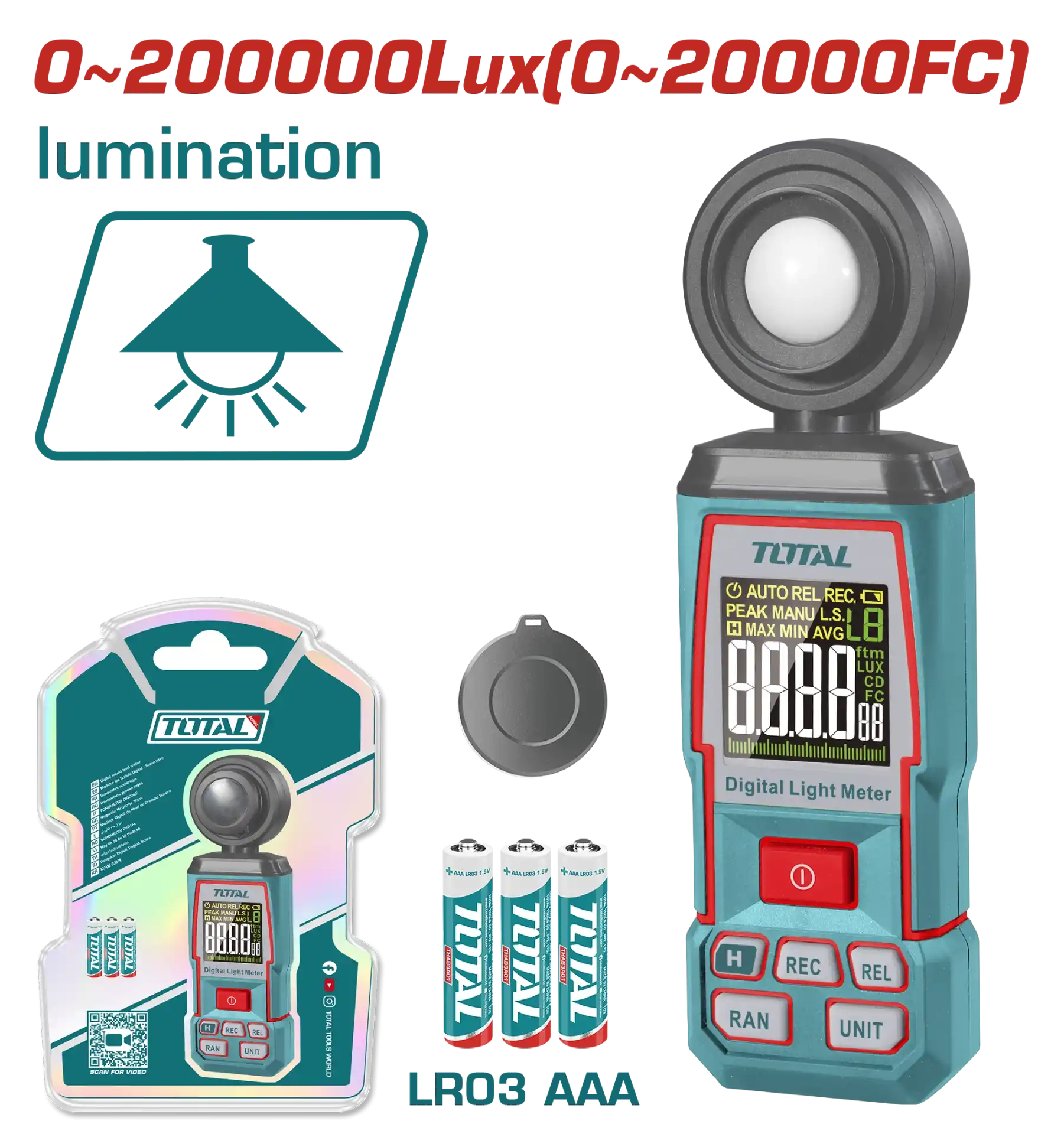 Bu profesyonel Total TETLU031 dijital ışık lüksmetresi, 0 ila 200.000 Lüks (0 ila 20.000 FC) arasında geniş bir ölçüm aralığı sunarak endüstriyel, fotoğrafçılık, sera ve ofis aydınlatma değerlendirmeleri için idealdir. 1 Lüks/1 FC çözünürlük ve akkor ışıkta (2854°K) ±(%3+5 Lüks) yüksek doğrulukla, bu ölçüm cihazı güvenilir ışık yoğunluğu ölçümleri sağlar.