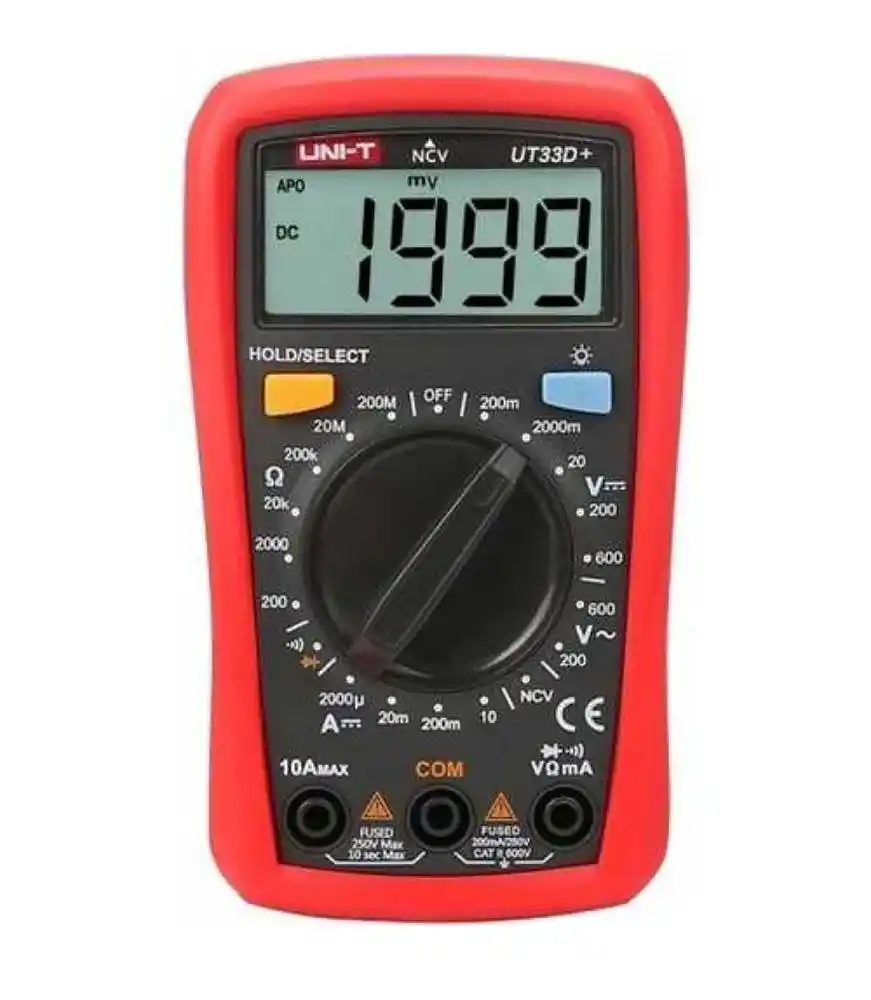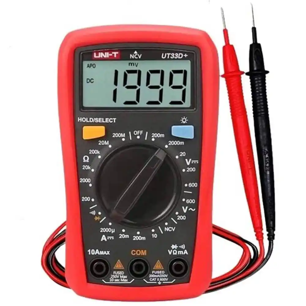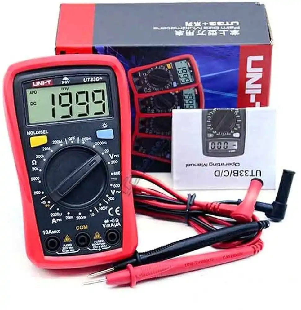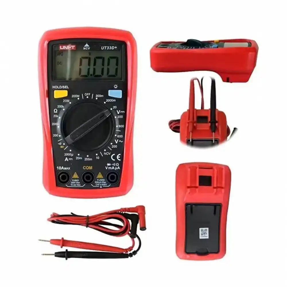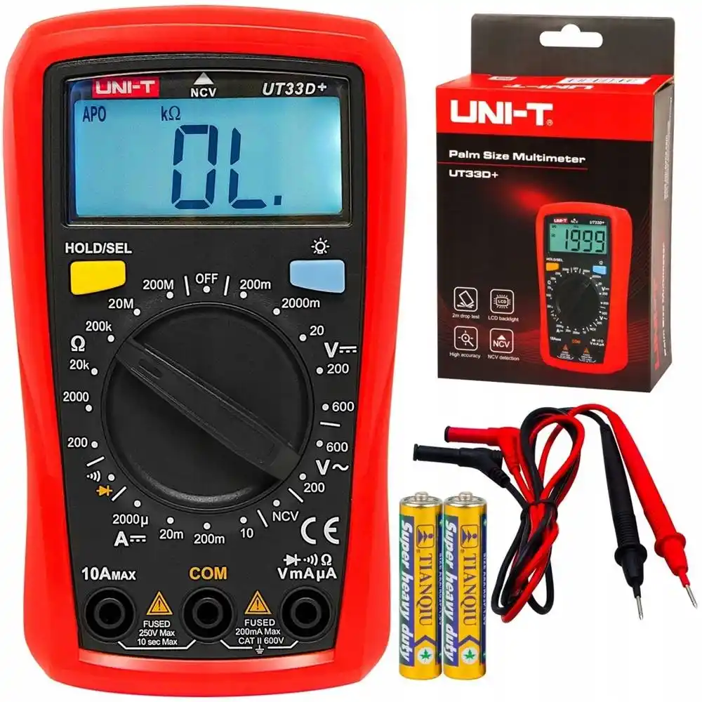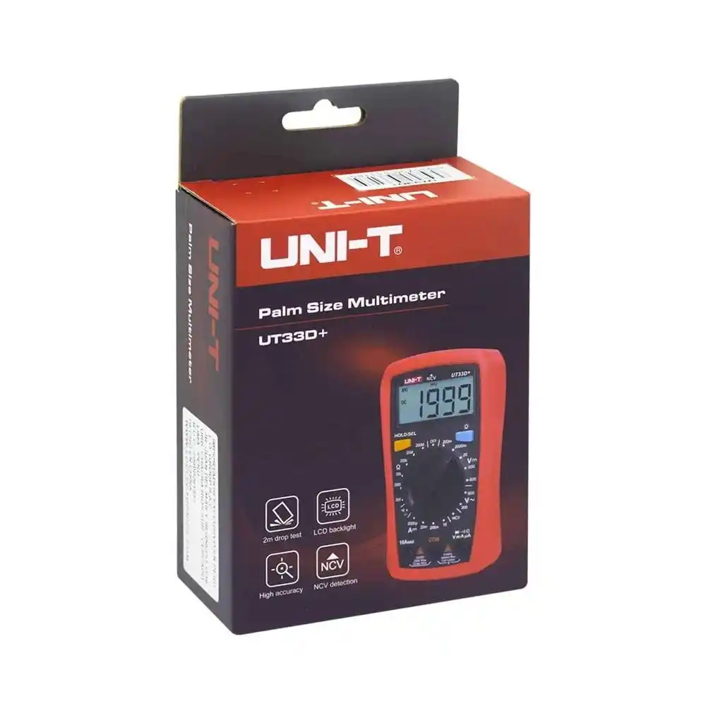 Uni-T UT33D+, elektriksel devrelerdeki gerilim, direnç ve akım değerlerini ölçen; entegre temassız voltaj algılama (NCV) özelliğiyle donatılmış, kompakt ve darbeye dayanıklı bir dijital test cihazıdır.