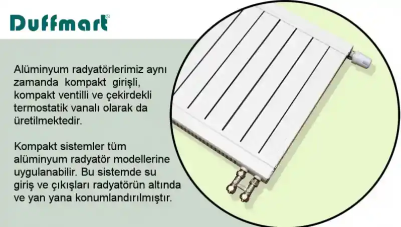 Duffmart Alize Alüminyum radyatörü kompakt girişli, kompakt ventilli ve çekirdek termostatik vana girişli olarak satın alabilirsiniz.