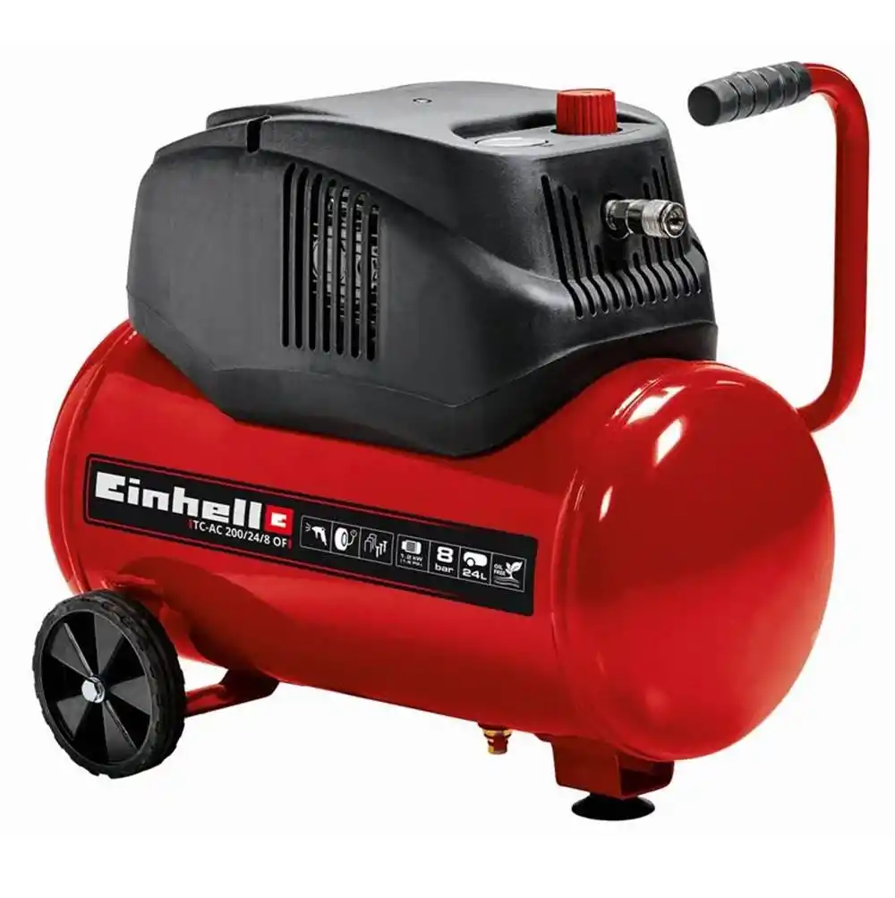 Einhell TC-AC 200/24/8 OF Yağsız Hava Kompresörü, 24 litrelik tank kapasitesine sahip, 8 bar basınç üretebilen mobil bir hava kompresörüdür. Bu cihazın en belirgin özelliği "Oil-Free" (Yağsız) bir motor yapısına sahip olmasıdır. Bu sayede cihaz, içinde yağ filtresi veya yağ seviye kontrolü gerektirmeden çalışır, taşınma sırasında yağ sızdırma riski taşımaz ve havaya yağ buharı karıştırmaz.