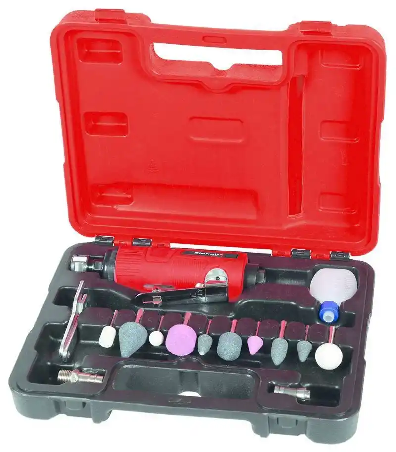 Einhell TC-PP 220 Kısa Havalı Kalıpçı Taşlama, taşlama, parlatma, kazıma ve çapak alma için yüksek kaliteli hassas bir alettir. Çubuk öğütücünün pimi, 9 mm veya daha fazla iç çapa sahip bir hortum kullanılarak 22.000 rpm'ye kadar bir hıza sahiptir.