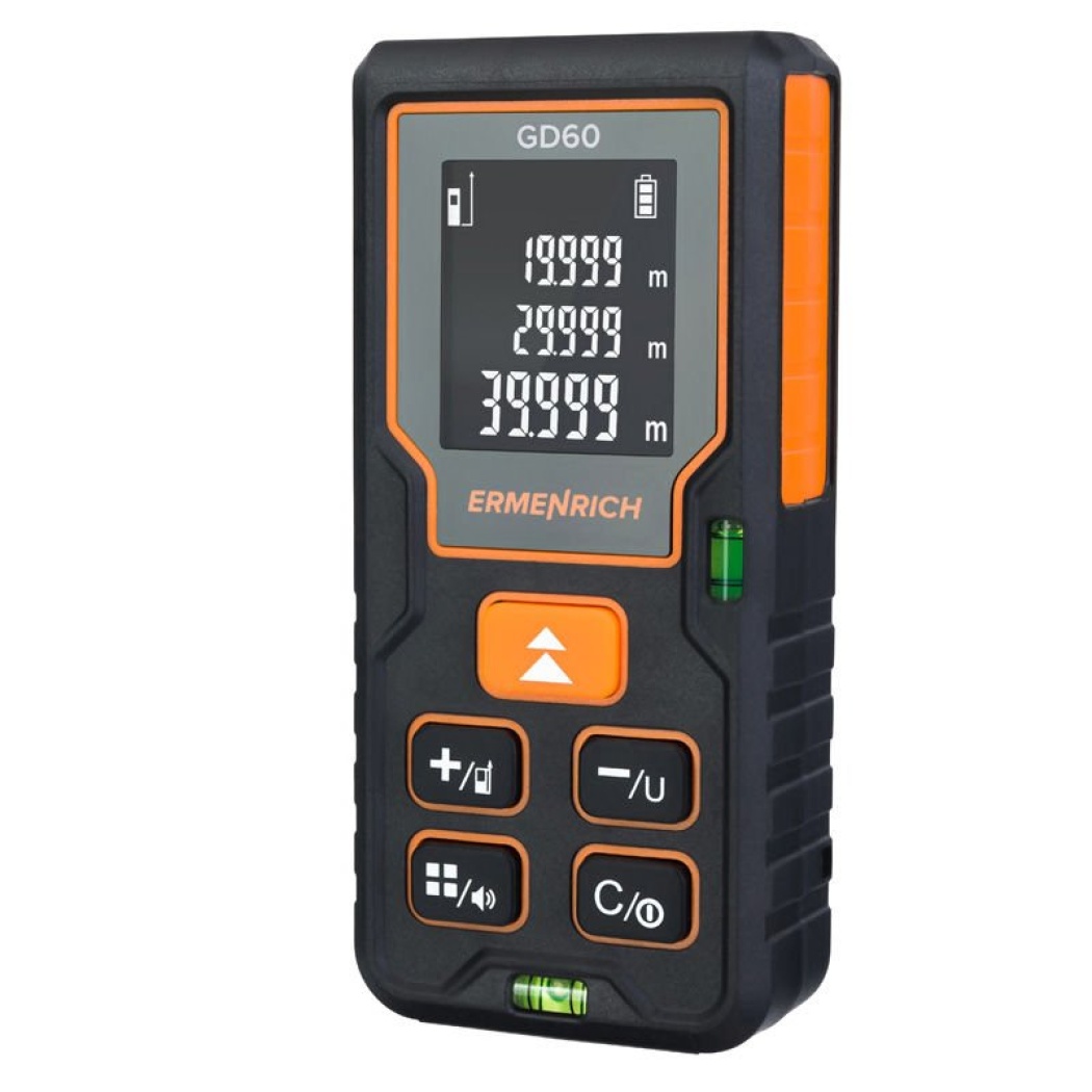 Ermenrich Reel GD60 Lazer Metre, inşaat, onarım, kurulum ve devreye alma işlerinde kullanılan evrensel bir ölçüm aracıdır. Cihaz, 0,05 ila 60 metre arasındaki mesafeleri, doğrusal boyutları, odaların alanlarını ve hacimlerini hızlı ve doğru bir şekilde ölçebilir. Ayrıca "Pisagor teoremi" adı verilen bir hesaplama işlevi sayesinde iki nokta arasındaki mesafeyi ara ölçümlerle hesaplayabilirsiniz.