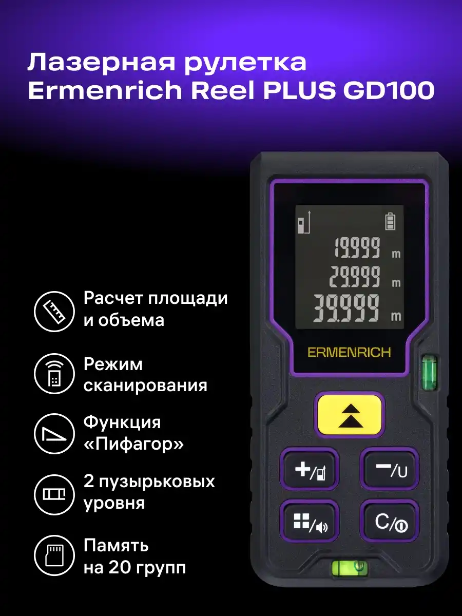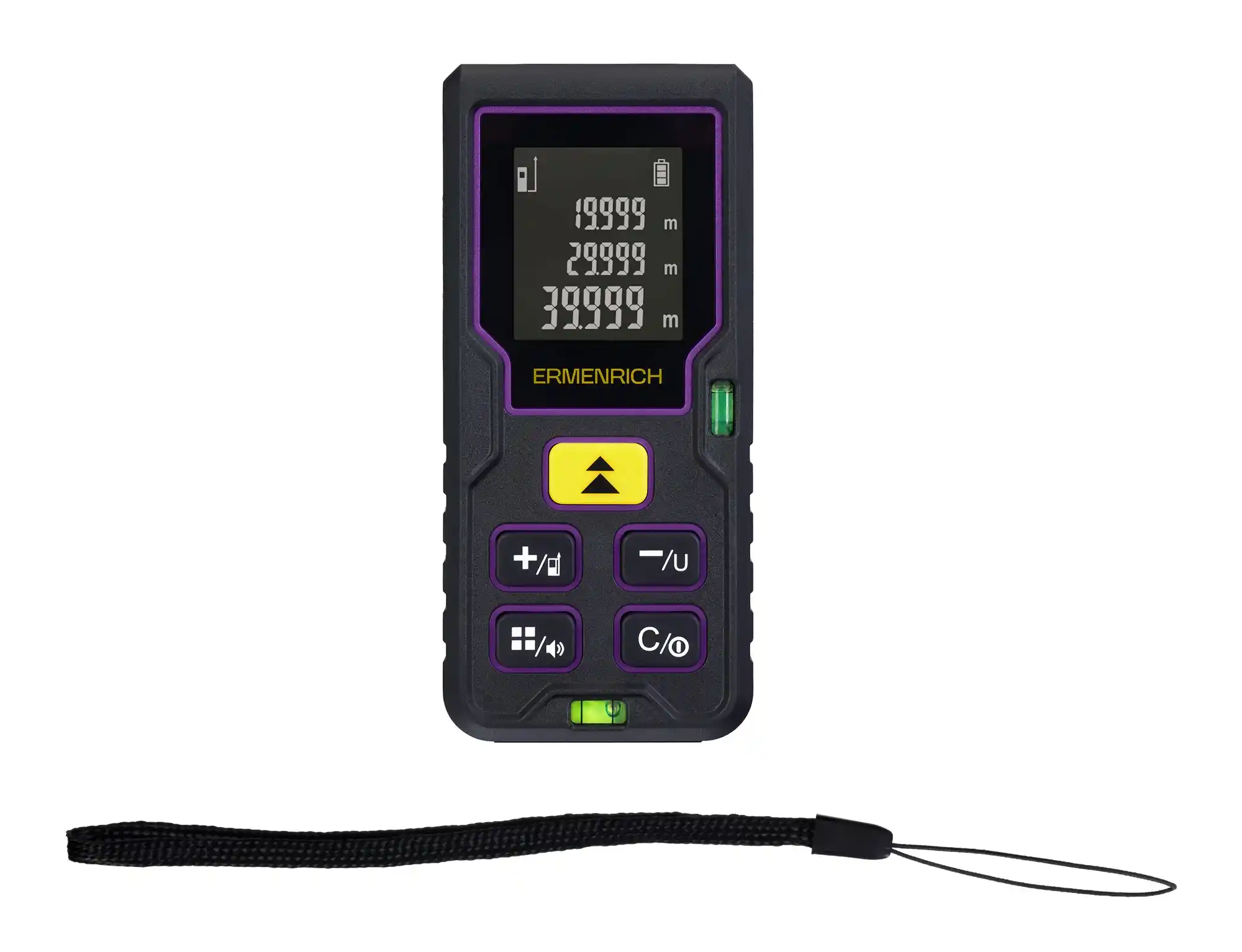 Ermenrich Reel PLUS GD100 Lazer Metre, makine mühendisliği, inşaat ve yenileme alanlarındaki çok çeşitli görevlerin üstesinden gelen çok işlevli bir cihazdır. En uygun olarak tek tarafı 100 metreye kadar olan büyük odaların doğrusal, alan ve hacim ölçümleri için kullanılır. Tek ölçümlere ek olarak, bir odayı otomatik olarak da tarayabilirsiniz. Veriler 3 satırlı LCD ekranda görüntülenir ve aynı anda 20 adede kadar sonuç grubu saklanabilir. Sesli uyarılar olmadan çalıştırılabilir.