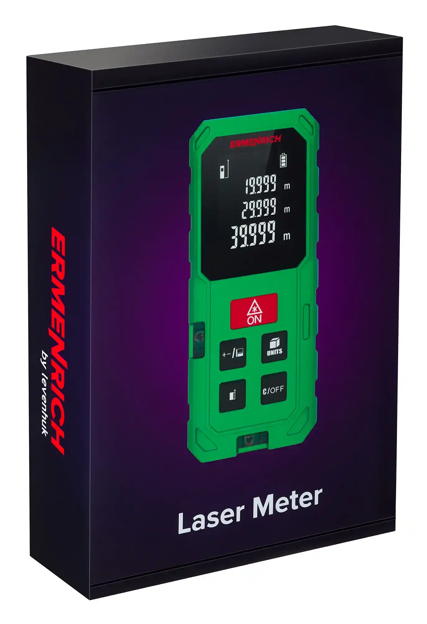 Ermenrich Reel PLUS GS40 lazer metre, basit kontroller ve çeşitli kullanışlı işlevler sayesinde kompakt ve pratik olan çok yönlü bir onarım ve inşaat aletidir. Cihaz, lazeri düz bir çizgide istenen noktaya yönlendirmenin mümkün olmadığı zor koşullar da dahil olmak üzere mesafeyi doğru bir şekilde ölçmenizi sağlar. Bu tür ölçümler için dolaylı ölçümler kullanarak mesafeyi hesaplamanızı sağlayan Pisagor teoremi özelliği kullanılır.