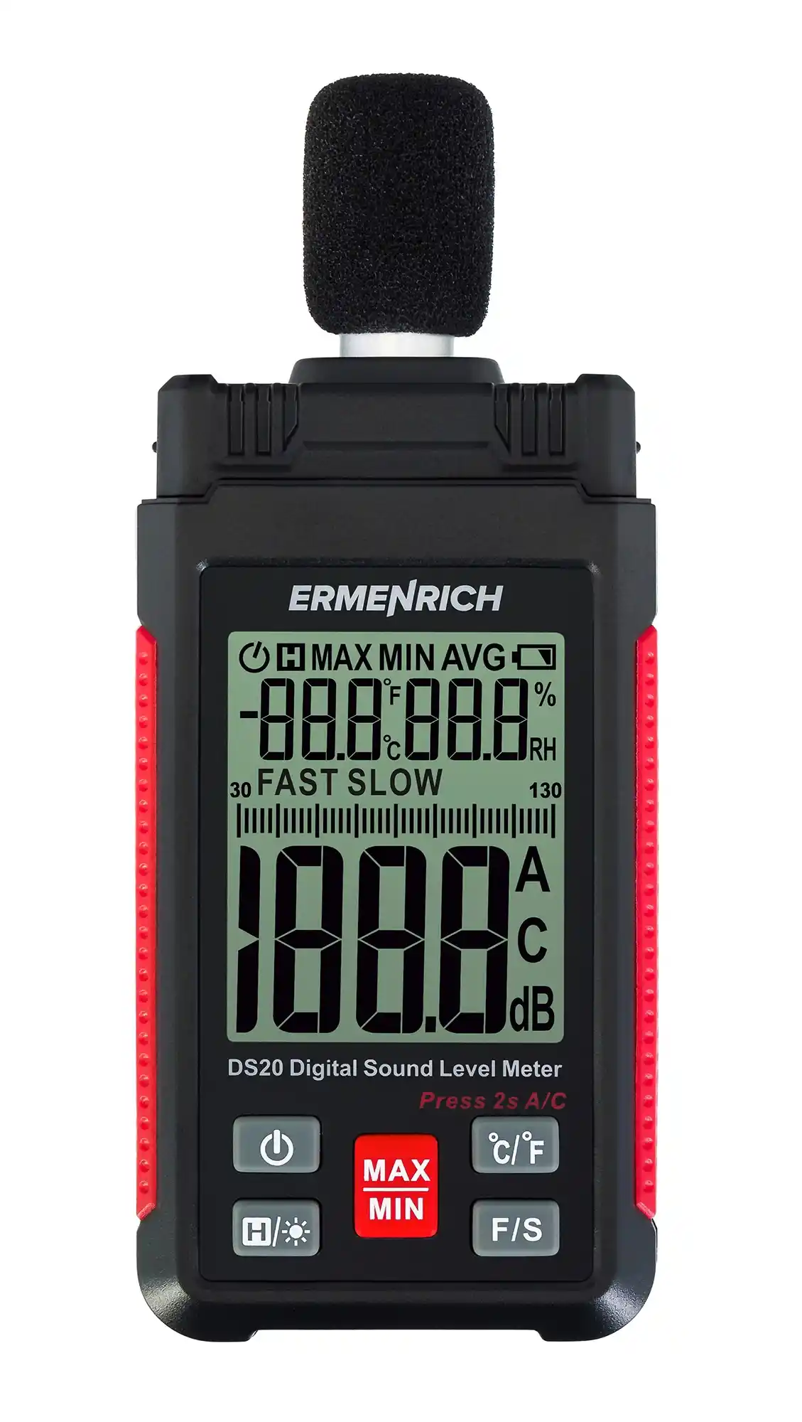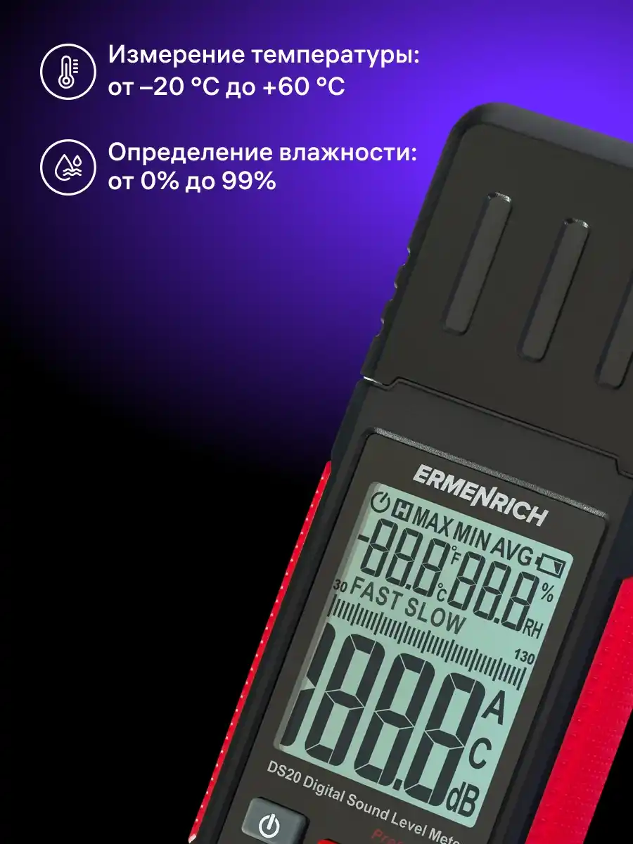 Ermenrich Seek DS20, iç ve dış mekanlarda gürültü seviyelerini, nemi ve sıcaklığı ölçmenizi sağlayan çok işlevli bir cihazdır. Konut, ofis veya endüstriyel alanlardaki koşulları izlemek ve böylece standartlara uygunluklarını kontrol etmek için kullanılabilir.