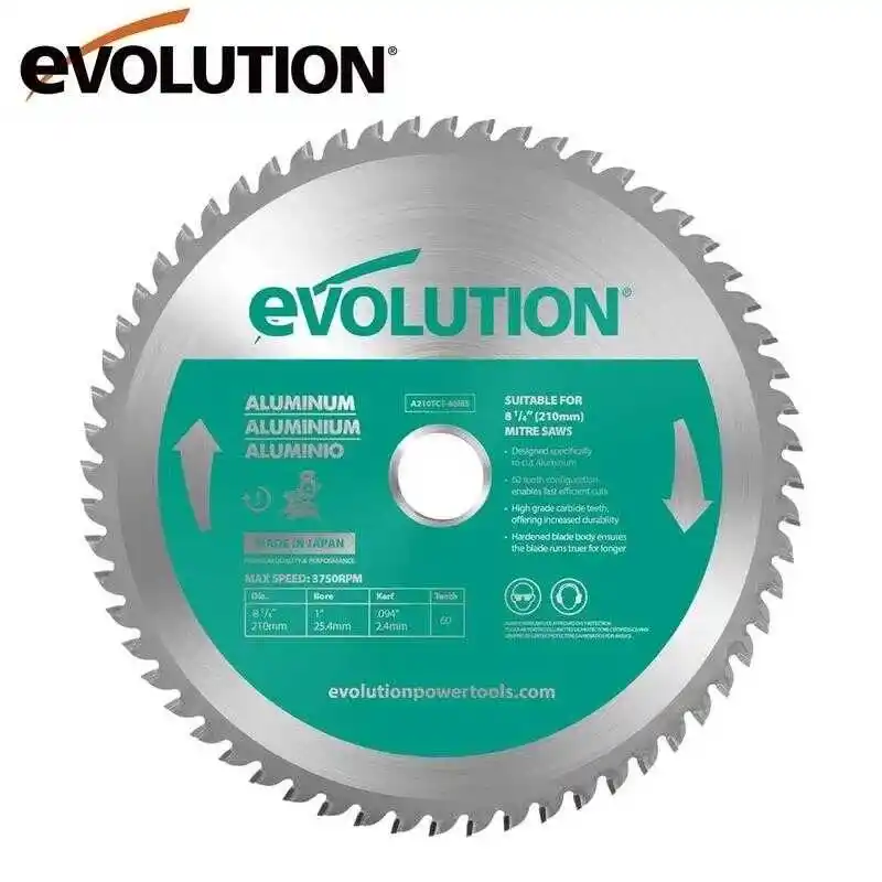 ● Evolution A210TCT-60MS, 210 mm çapında, 60 dişli, Tungsten Karbür Uçlu (TCT) alüminyum kesimi için Gönye Testere Bıçağıdır. Tüm 210 mm Evolution gönye testereleriyle uyumludur.
