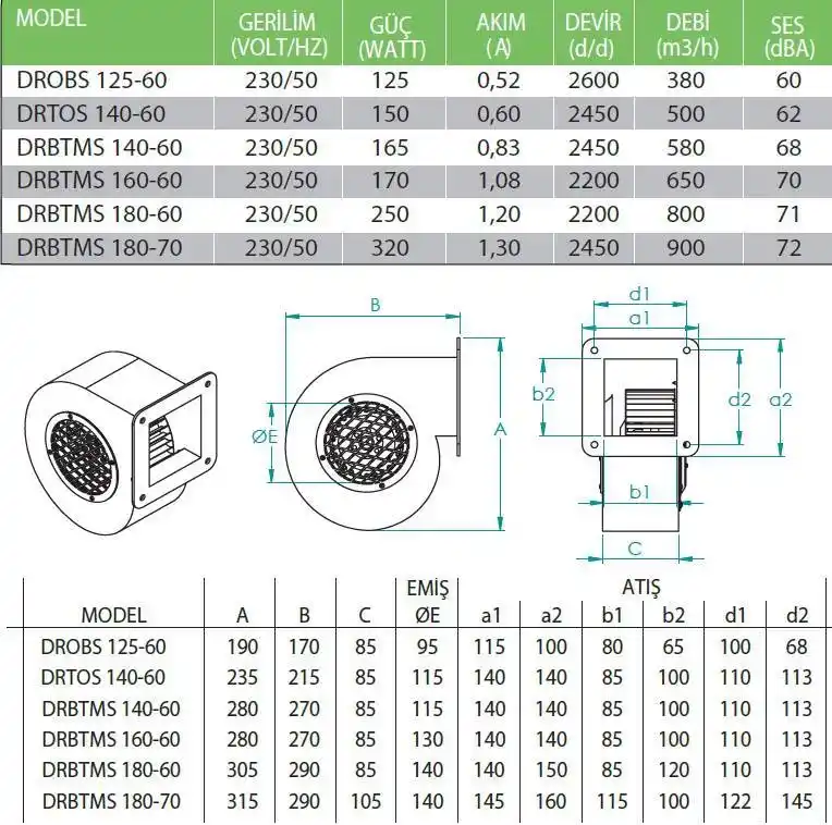 Fanexfan DRBTMS 160-60 Dıştan Rotorlu Radyal Fan, motor termik korumalıdır.
