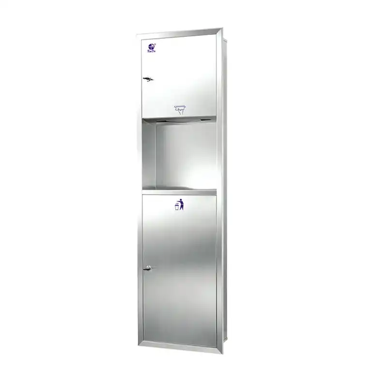 Xinda GSG63AR, duvar içine gömülerek monte edilen (ankastre), yüksek kapasiteli bir kağıt havlu dispenseri ile atık çöp kovasını tek bir dikey sütunda birleştiren profesyonel bir banyo ünitesidir. Üst kısımda Manuel Z veya V katlama kağıt havlular için kilitli bir hazne bulunurken, alt bölümde kullanılan kağıtların gizli bir şekilde atılabileceği entegre bir çöp kovası yer alır.