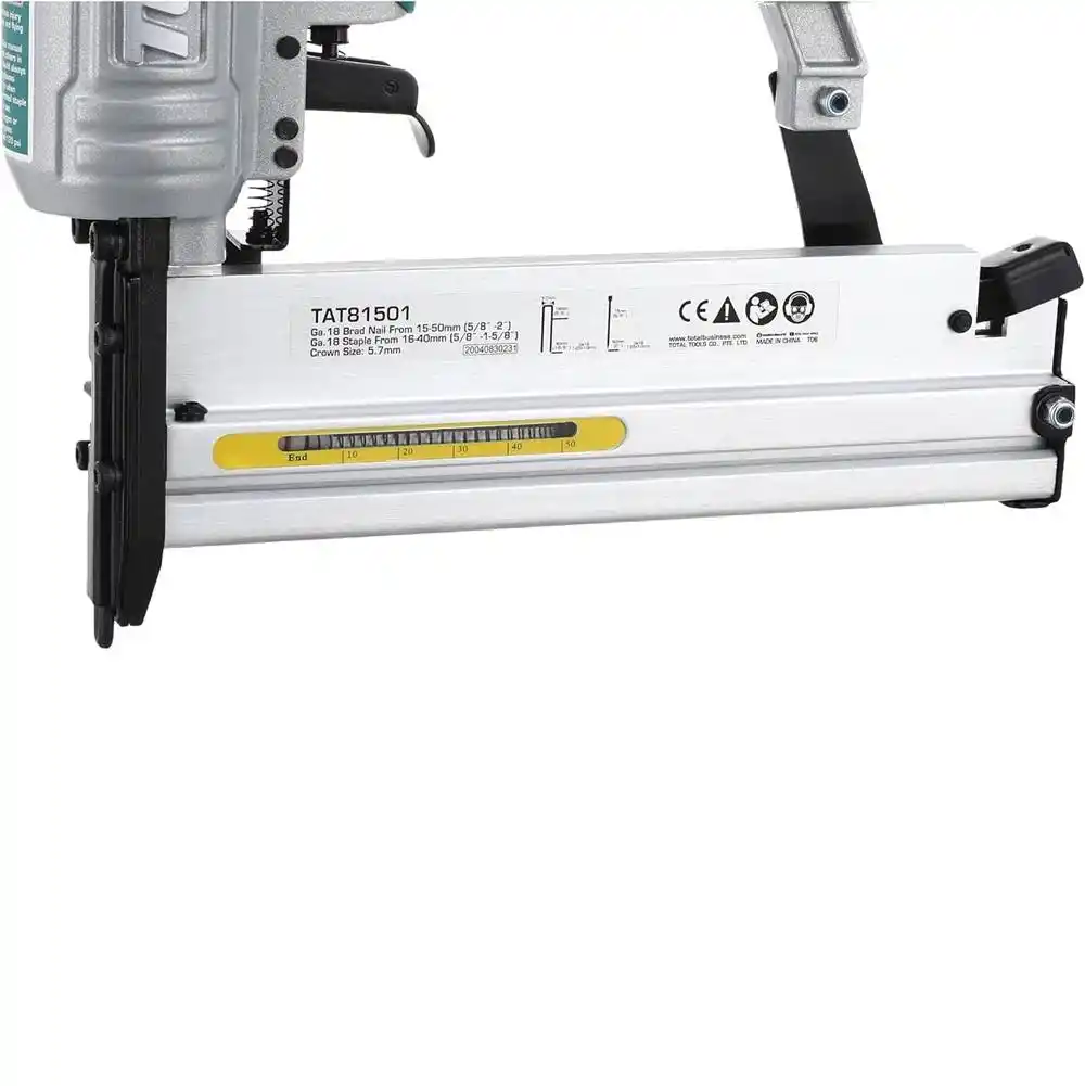 Total TAT81501, hem 15-50 mm arası çivileri hem de 16-40 mm arası zımba tellerini yüksek hızla çakabilen, düşük hava tüketimiyle çalışan profesyonel bir pnömatik (havalı) el aletidir.
