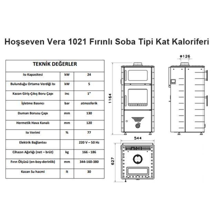 Hem bulunulan ortamı ısıtıp hemde diğer odalarınızı radyatörle ısıtmak,verimli bir yakıt kullanmak için ideal bir ürün olan Hoşseven Vera 1021 Fırınlı Soba Tipi Kat Kaloriferi 2 yıl garanti ile satılmaktadır.Yaygın servis ağı ile satılan Hoşseven Vera 1021 Fırınlı Soba Tipi Kat Kaloriferi yanarken sobanın üst kısmı döküm olduğu için burada su ısıtabilir,yiyecekleri ısıtma yapabilirsiniz. Hoşseven soba tipi kat kaloriferleri yakıtlarınızın verimli ve ekonomik olarak kullanılmasını temin eder. Mekanik hava ayarı sayesinde sobayı istediğiniz sıcaklıkta kullanma imkanınız vardır. Hoşseven Vera 1021 Fırınlı Soba Tipi Kat Kaloriferinin bulunduğu ortamı ısıttığı için buraya radyatör bağlamanıza gerek kalmaz.