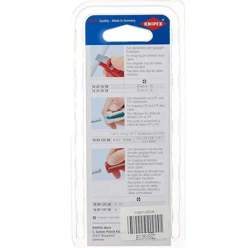 Knipex 16 80 125 SB Universal Kablo Sıyırma Aleti, kablo borusu ve dağıtıcı buatlarda da kullanılabilecek çok yönlü bir araçtır. İki parçalı, açılabilir izolasyon sıyırma aleti sayesinde kolaylıkla farklı kablo tiplerine uyum sağlar.