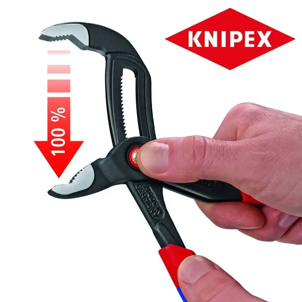 Bu cihaz, Knipex'in ikonik Cobra teknolojisini elektrikçi güvenliği ile birleştirir. Geleneksel penselerin aksine, ağız genişliği yaylı bir düğme aracılığıyla doğrudan iş parçası üzerinde ayarlanır. Kendi kendine kilitlenen (self-locking) ağız yapısı, boru veya somun üzerine bir kez yerleştirildiğinde, kullanıcı saplara baskı yapmasa bile kayma yapmaz. VDE onaylı daldırma izolesi, yüksek gerilimli hatlarda çalışırken tam güvenlik sağlarken, özel sertleştirilmiş diş yapısı iş parçasını bir mengene gibi kavrar.