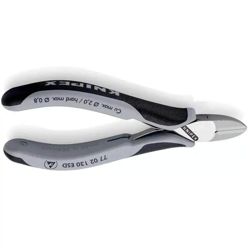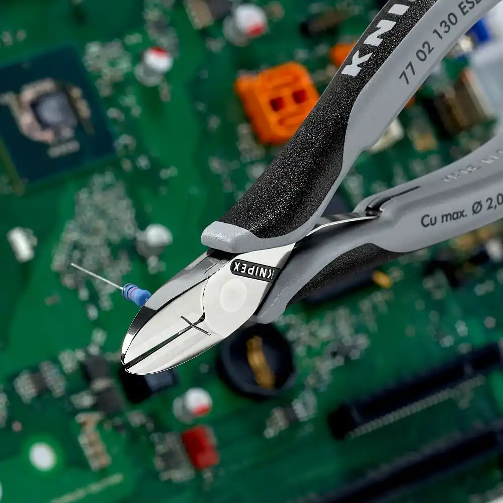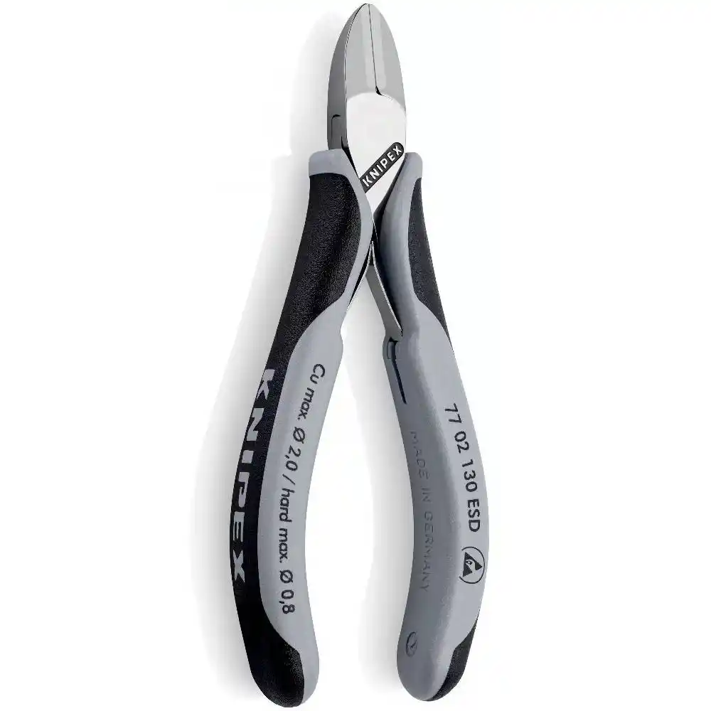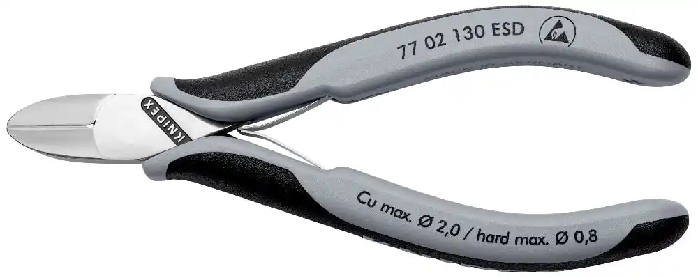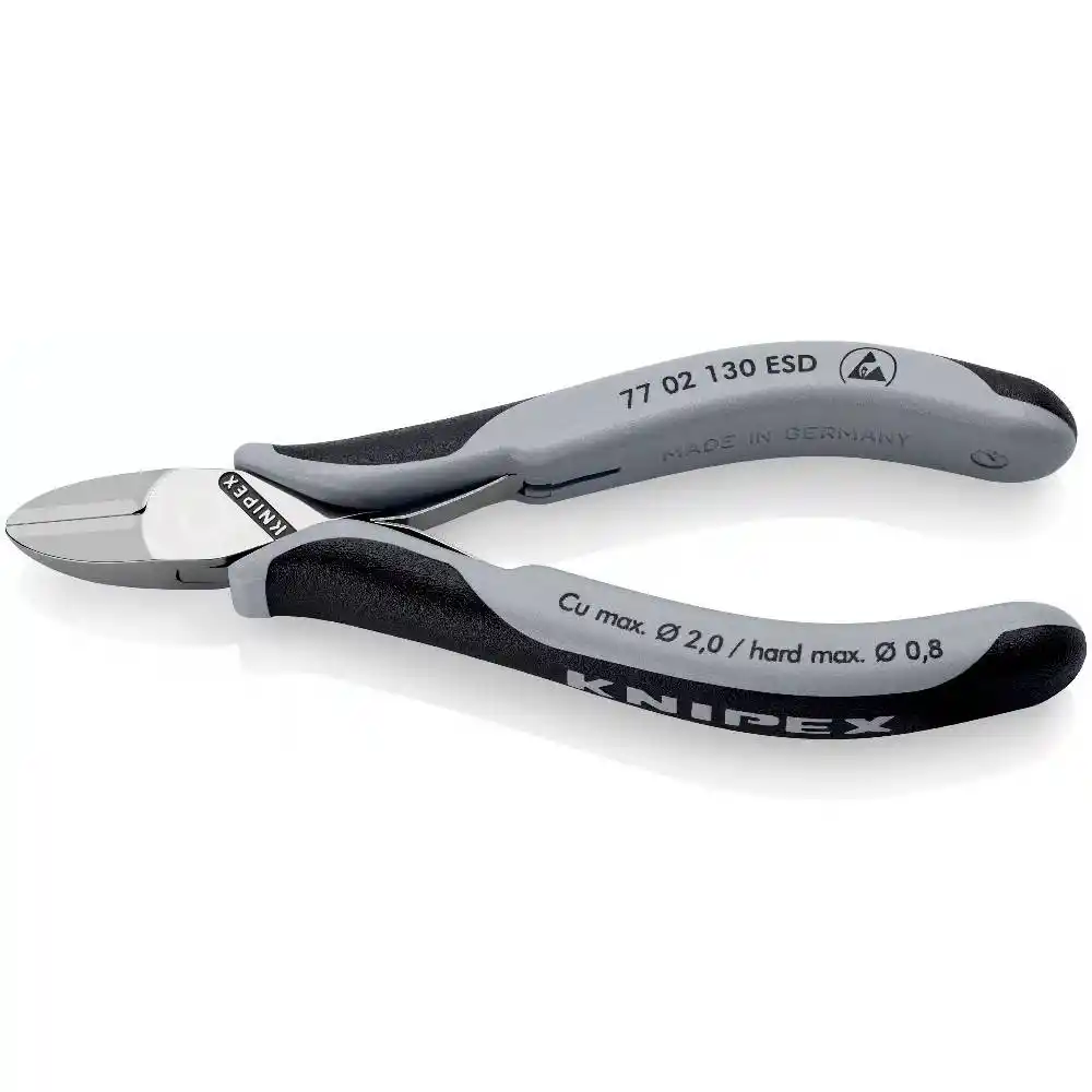 Antistatik özellikli gri Knipex 77 02 130 ESD Elektronikçi Yan Keski, tutamaç kısmı antistatik özellikli olacak şekilde ve vücutta oluşan statik elektriğin çalışılan alanı etkilememesini sağlamak amacıyla üretilmiştir.