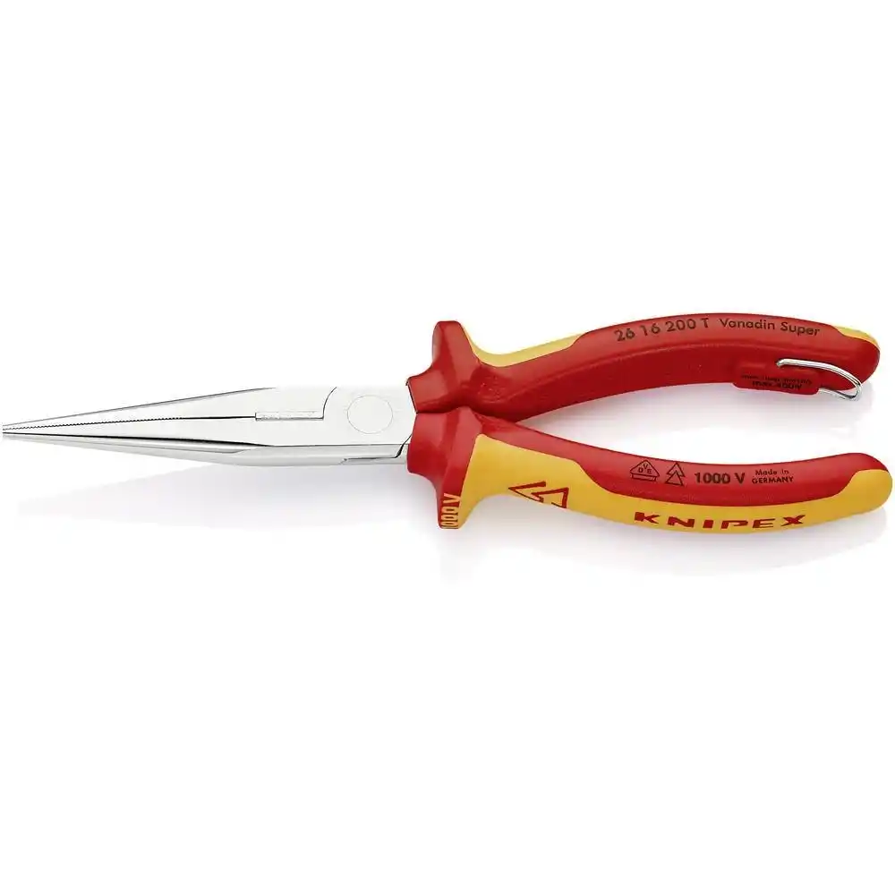 Knipex 26 16 200 T, 1000V izoleli korumaya ve yüksek esneklik kabiliyetine sahip, uçları burulmaya dayanıklı, kesicili ve düşme emniyet halkalı bir profesyonel elektrikçi kargaburun pensesidir.