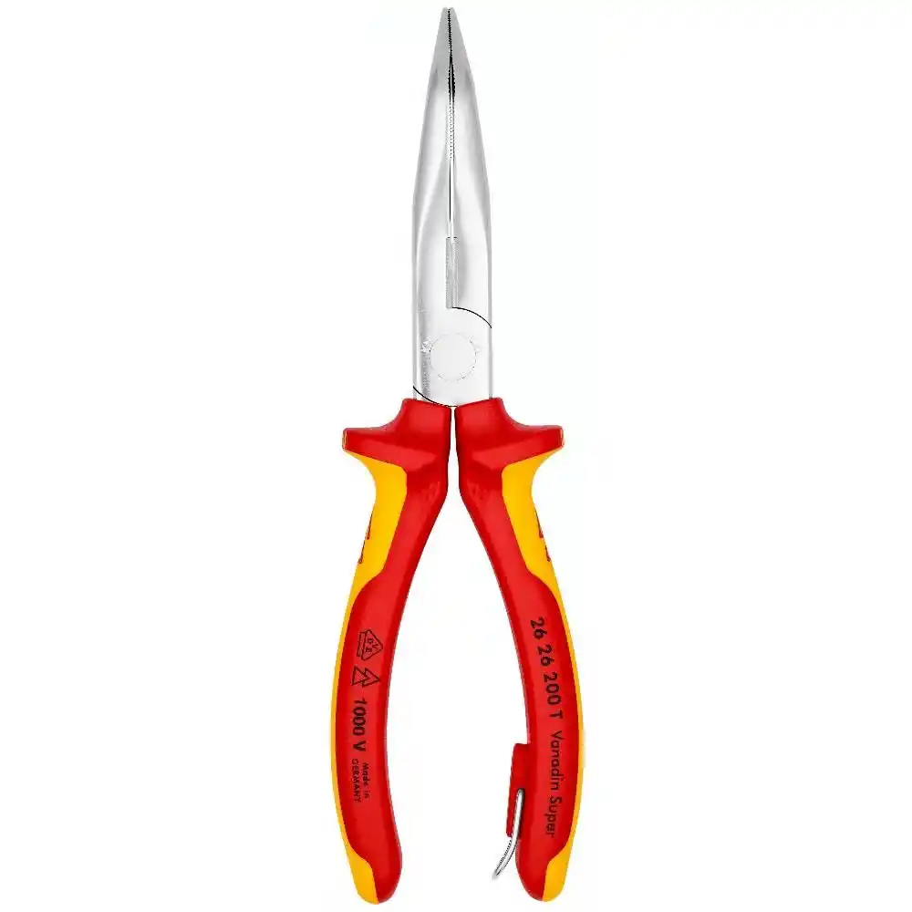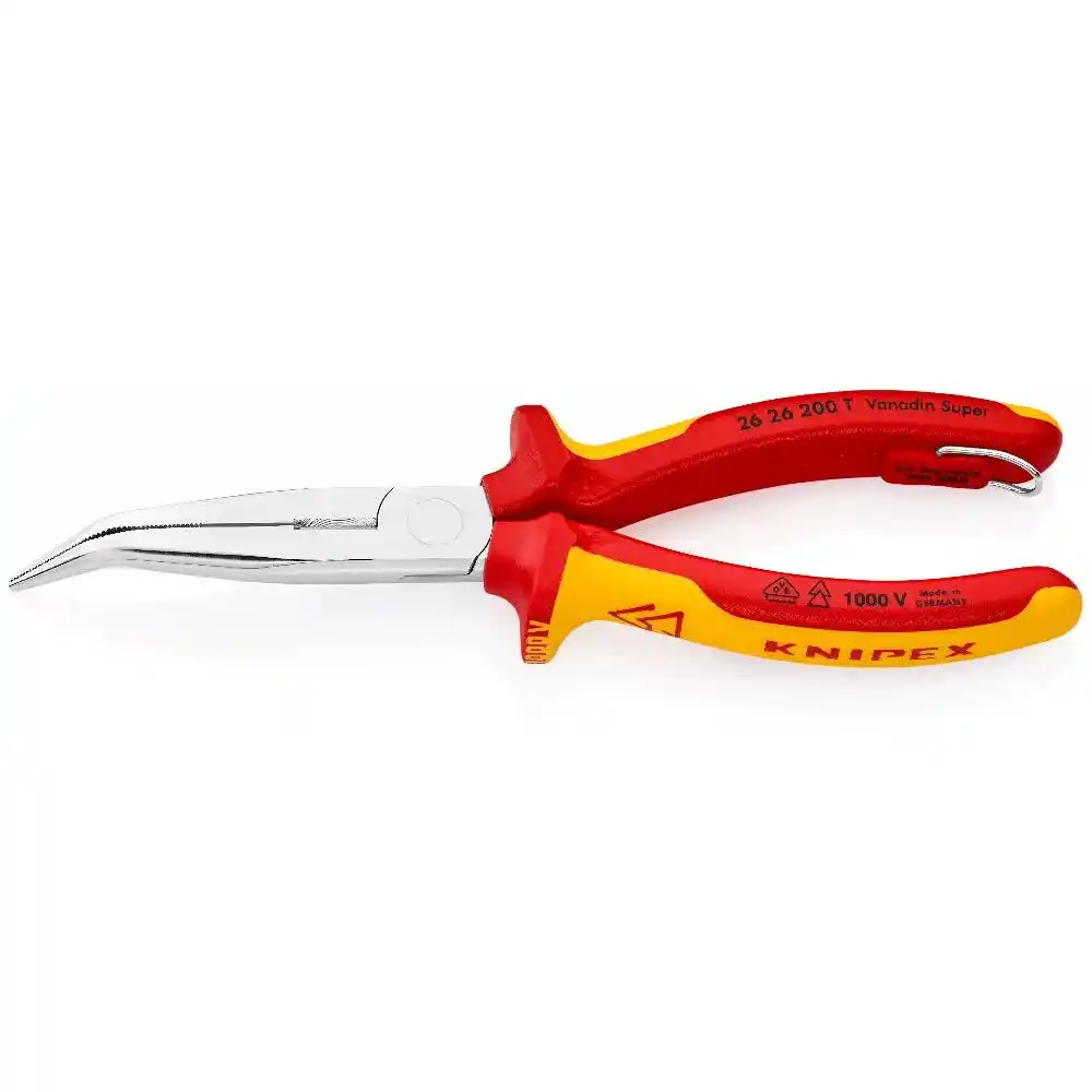 Knipex 26 26 200 T, 40 derece açılı "leylek burnu" formu ve 1000V VDE izolasyonu ile elektrik tesisatlarında dar ve görüş açısı kısıtlı alanlarda hassas kavrama, bükme ve kesme yapan yüksek performanslı bir el aletidir.