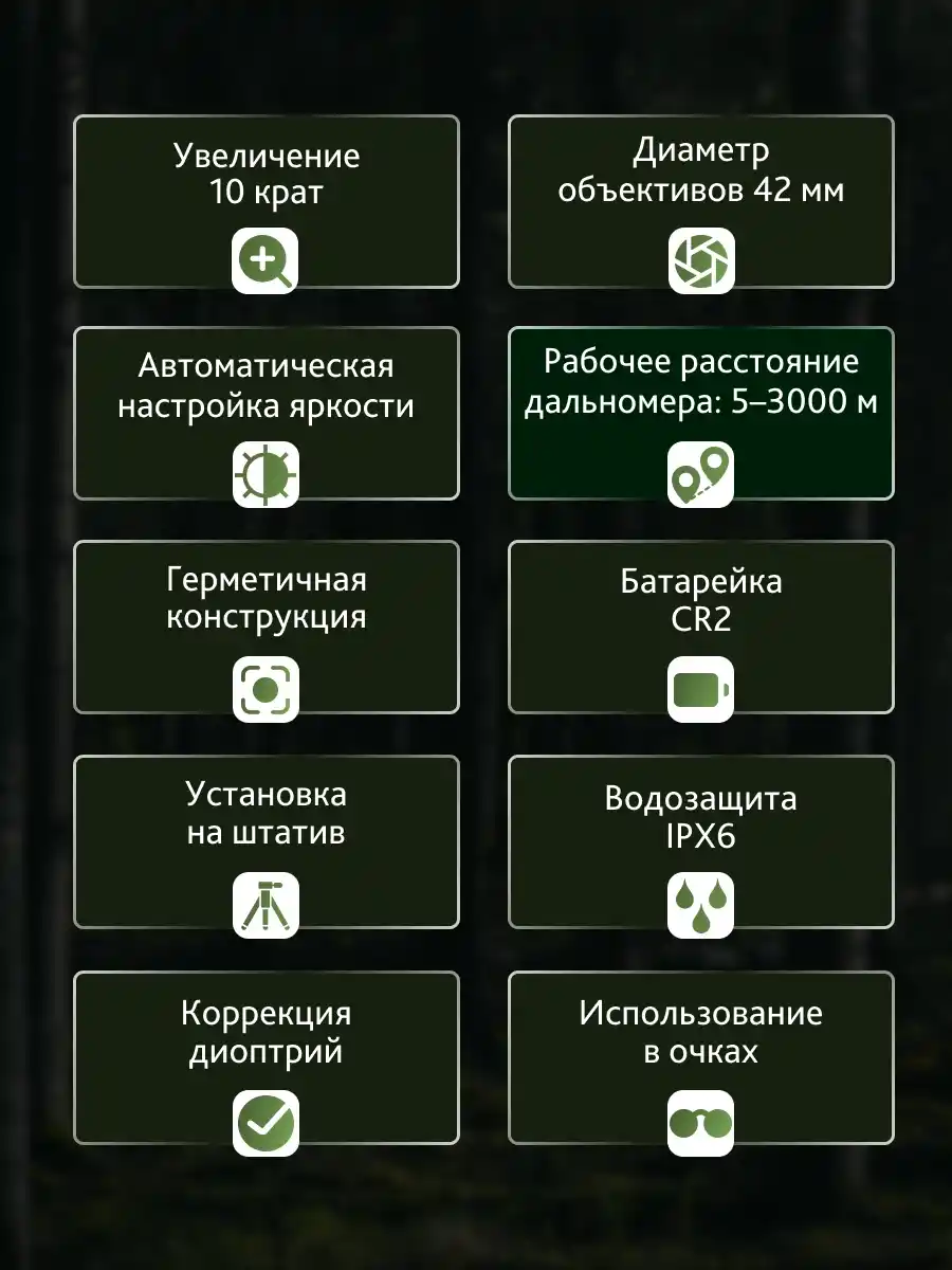 Binoküler dürbünler yerleşik bir lazer mesafe ölçer ile donatılmıştır. Değerler dahili ekranda kırmızı renkte görüntülenir. Ekran, ışık hassasiyetini ve parlaklığını otomatik olarak ayarlar. Mesafe ölçer doğrudan mesafeyi, yatay mesafeyi ve açıları belirleyebilir. Tek ölçüm veya sürekli tarama modunu seçebilirsiniz. Ölçüm birimleri metre veya yard düğmesi kullanılarak ayarlanır. Ağaç kadar uzun bir nesneye olan mesafeyi 3000 m'ye kadar, bir geyiğe olan mesafeyi 1100 m'ye kadar ve bir insana olan mesafeyi 700 m'ye kadar ölçebilirsiniz.