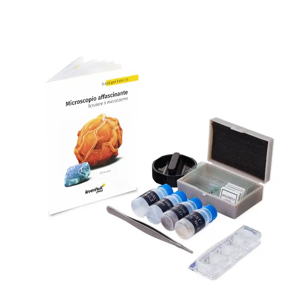 Mikroskop, ilgi çekici deneylerin yapılması için özel bir kit ile birlikte sunulur. Bu kit hazırlanmış slaytları, mikroskobik çalışmalar için araçları ve ayrıntılı bir kullanım kılavuzunu içerir.