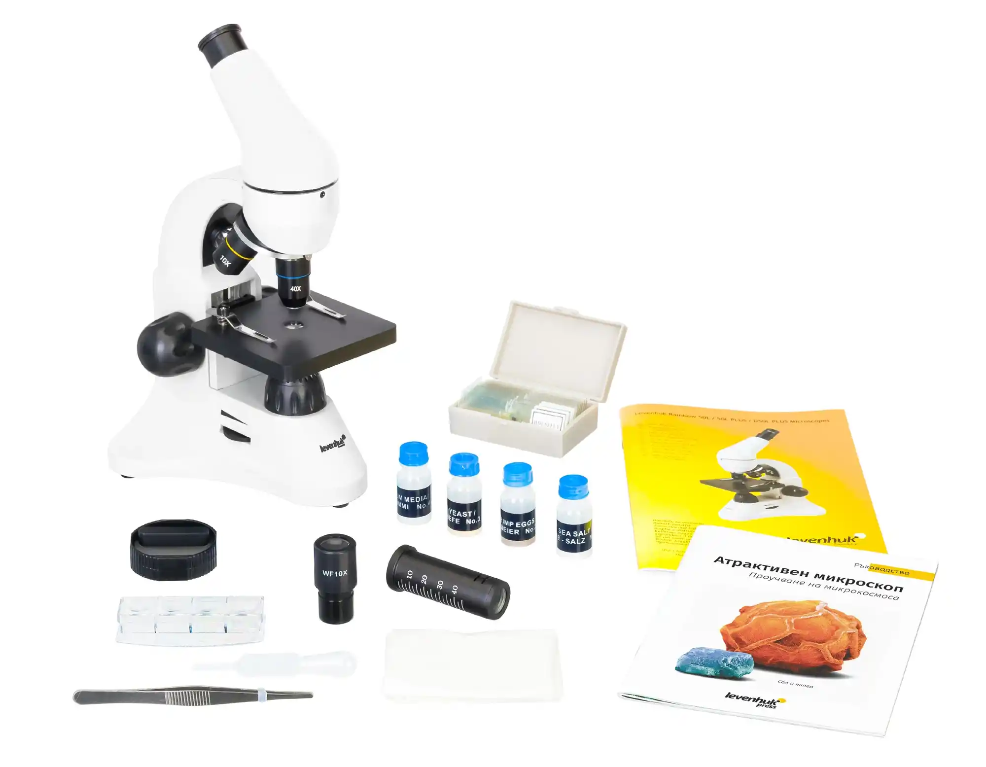 Mikroskop, bir dizi heyecan verici deney yapmanıza olanak tanıyacak bir deney setiyle birlikte sunulur. Kit, yeni mikroskopunuzu hemen deneyebilmeniz için hazırlanmış numunelerin yanı sıra kendi numunelerinizi hazırlamanız için araçları içerir. Kite dahil bir kullanışlı kullanım kılavuzu ile mikroskopun yapısı hakkında faydalı bilgiler, mikroskopla çalışma için ipuçları ve ilgi çekici deneylerin açıklamaları sunulmaktadır.