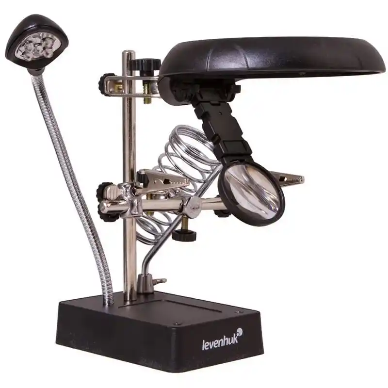 Levenhuk Zeno Desk D11 Büyüteç, küçük öğeleri ve çalışma araçlarını daha yakından incelemek için tasarlanmış bir masaüstü büyüteçtir. 10x ve 20x olmak üzere iki farklı büyütme gücü sunar ve dahili LED aydınlatması ile loş ışık koşullarında bile net görüntüler sağlar. Büyüteç, küçük nesneleri daha kolay tutabilmek için özel bir tutucu ile birlikte gelir ve demir lehimleme havyası için de bir tutucu vardır.