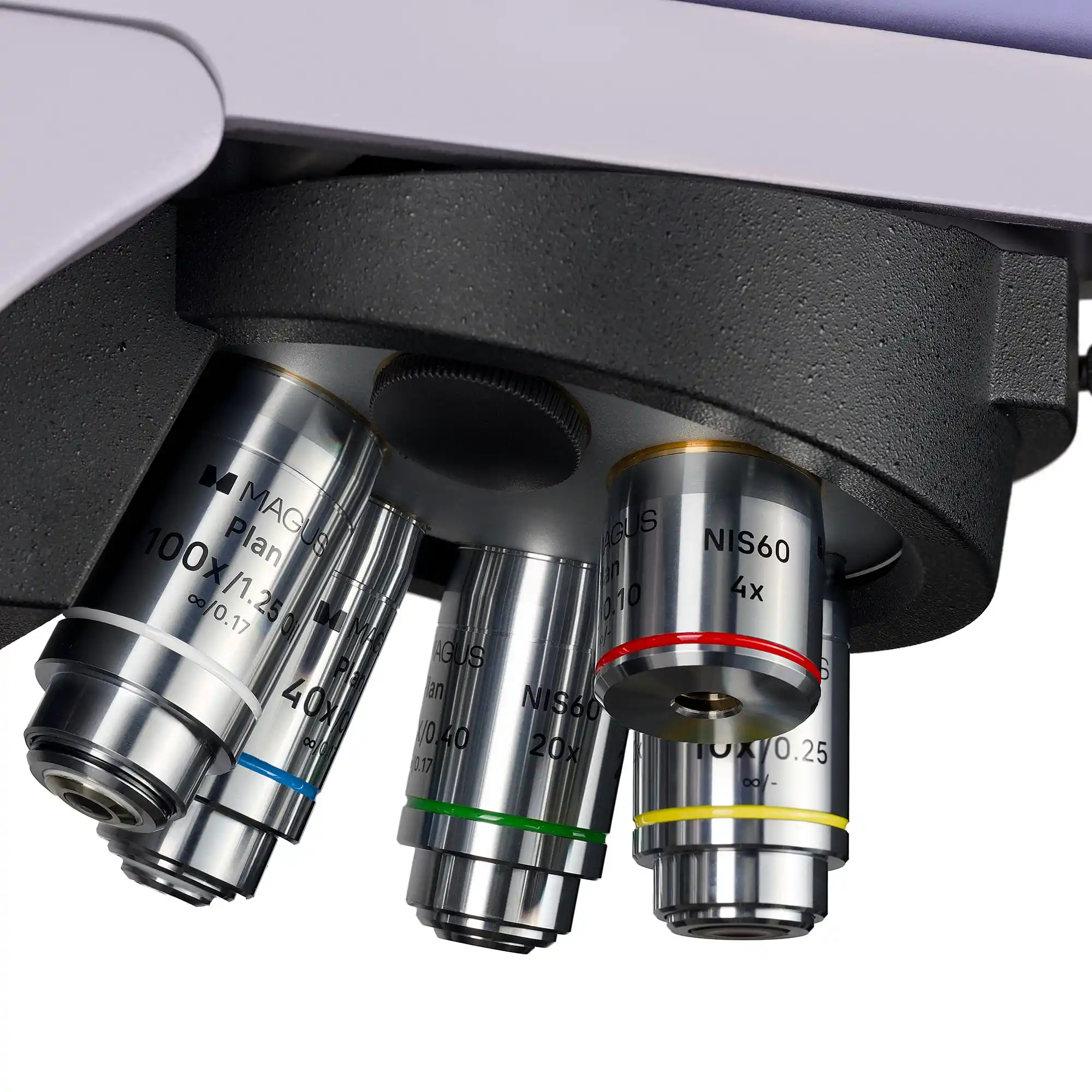 6 objektif için motorlu döner burun parçası iç kısma doğru yönlendirilmiştir: Kullanıcı optik yola yerleştirilmiş objektifi görür ve nesne tablasının üzerindeki alan boştur. Ekstra büyütme elde etmek için boş yuvaya ek bir objektif de takılabilir. Objektifler plan akromatiktir, parfokal yüksekliği – 60 mm.