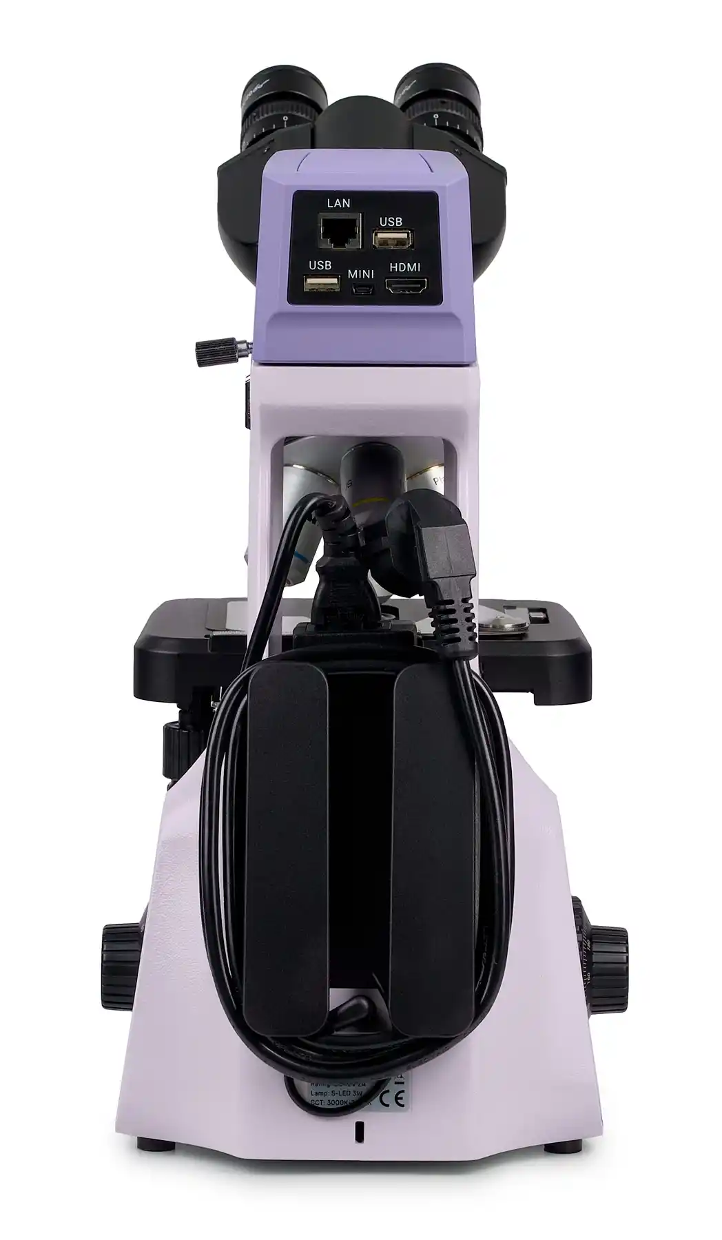 Binoküler başlık ayrıca tasarıma katkıda bulunur: Dijital kamera içine yerleştirilmiştir ve fazladan yer kaplamaz. Her iki tüp de kendi ekseni etrafında 360° dönebilmektedir ve böylece göz mesafesini ihtiyaçlarınıza göre ayarlayabilirsiniz. Mikroskop 10x/20 mm göz mercekleriyle donatılmıştır ve lenslerin göz merceklerine temas etmesini ve hasar görmesini önlemek amacıyla gözlüklü kullanıcılar için kullanışlı düz kauçuk göz mercekleri içerir. Optik parçalar sonsuzluk düzeltimlidir. Mikroskobun tüpleri üzerinde kullanıcının görme keskinliğine göre ayarlanan diyoptri ayar halkaları bulunmaktadır.