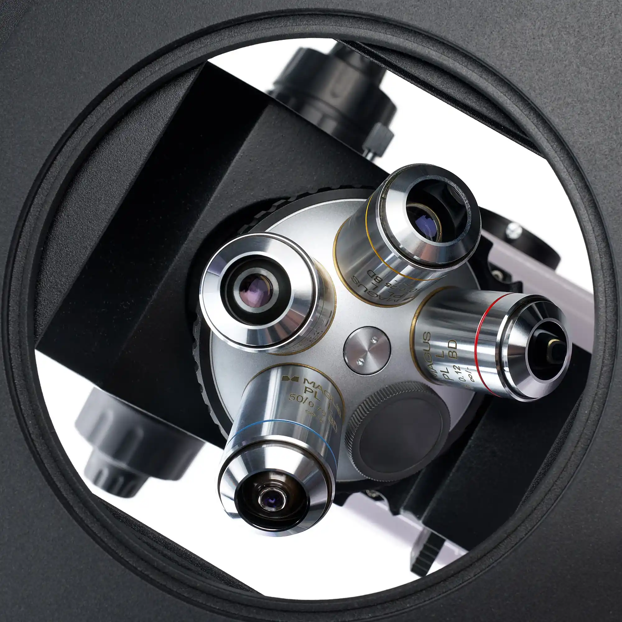 İncelenen örneğin altında 5 objektif için döner burun parçası bulunmaktadır. Birlikte verilen objektifleri takmak için 4 yuva ve ek bir objektif takmak için bir yuva daha vardır. Bu mikroskobun tüm objektifleri BD olarak etiketlenmiştir; yani, parlak alan ve karanlık alan mikroskopisi için özel olarak tasarlanmıştır ve uzun bir çalışma mesafesine sahiptir.