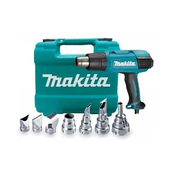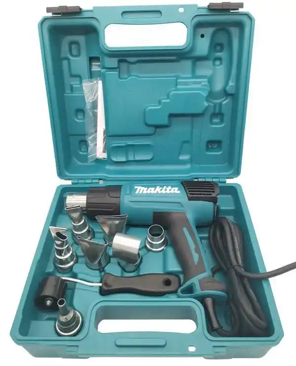 Sıcak hava tabancası bir kutuda ve çeşitli ataşmanlarla birlikte gelir.