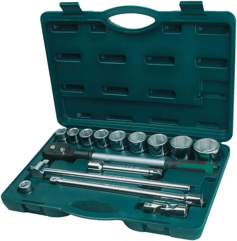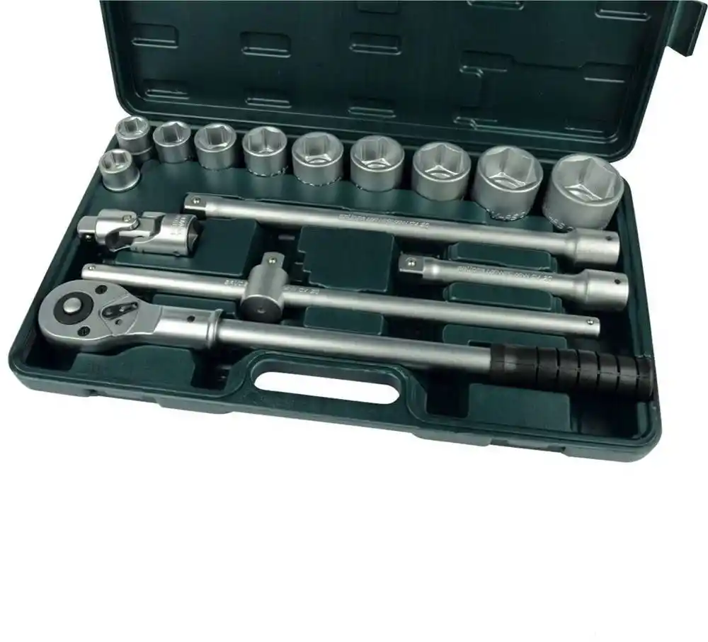 3/4" bağlantı, ağır hizmet tipi endüstriyel sınıf, kapak seti. İki kez nikel kaplı ve mat krom kaplı yüzeyli krom vanadyum çelik. Yan sistemli soketler sayesinde artırılmış güç aktarımı, aşınmış ve hasar görmüş somun ve cıvataları bile sorunsuz bir şekilde gevşetir. 2 uzatma parçası, diz eklemi, kayar parça ve 10 soket (22 - 50 mm) içeren cırcır.