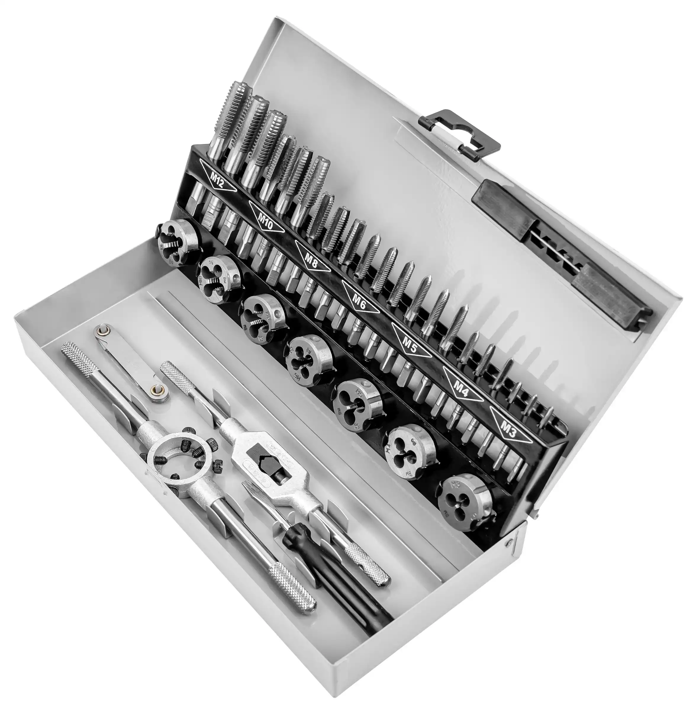 Setin en önemli özelliği, kılavuzların üçlü takımlar (ön, orta ve bitirme kılavuzu) halinde sunulmasıdır. Bu yöntem, diş açma işleminin kademeli olarak yapılmasını sağlayarak metalin zorlanmasını engeller ve daha pürüzsüz, standartlara uygun dişlerin elde edilmesine imkan tanır. Tüm parçalar, profesyonel kullanım için uygun olan yüksek kaliteli alaşımlı çelikten imal edilmiştir.