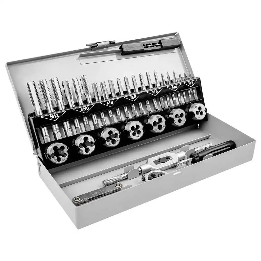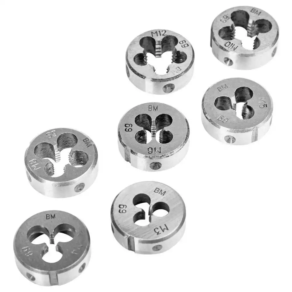 7 adet yuvarlak pafta lokması, suda sertleşmiş, sarsım dirençli takım çeliğinden mamül: M3, M4, M5, M6, M8, M10, M12