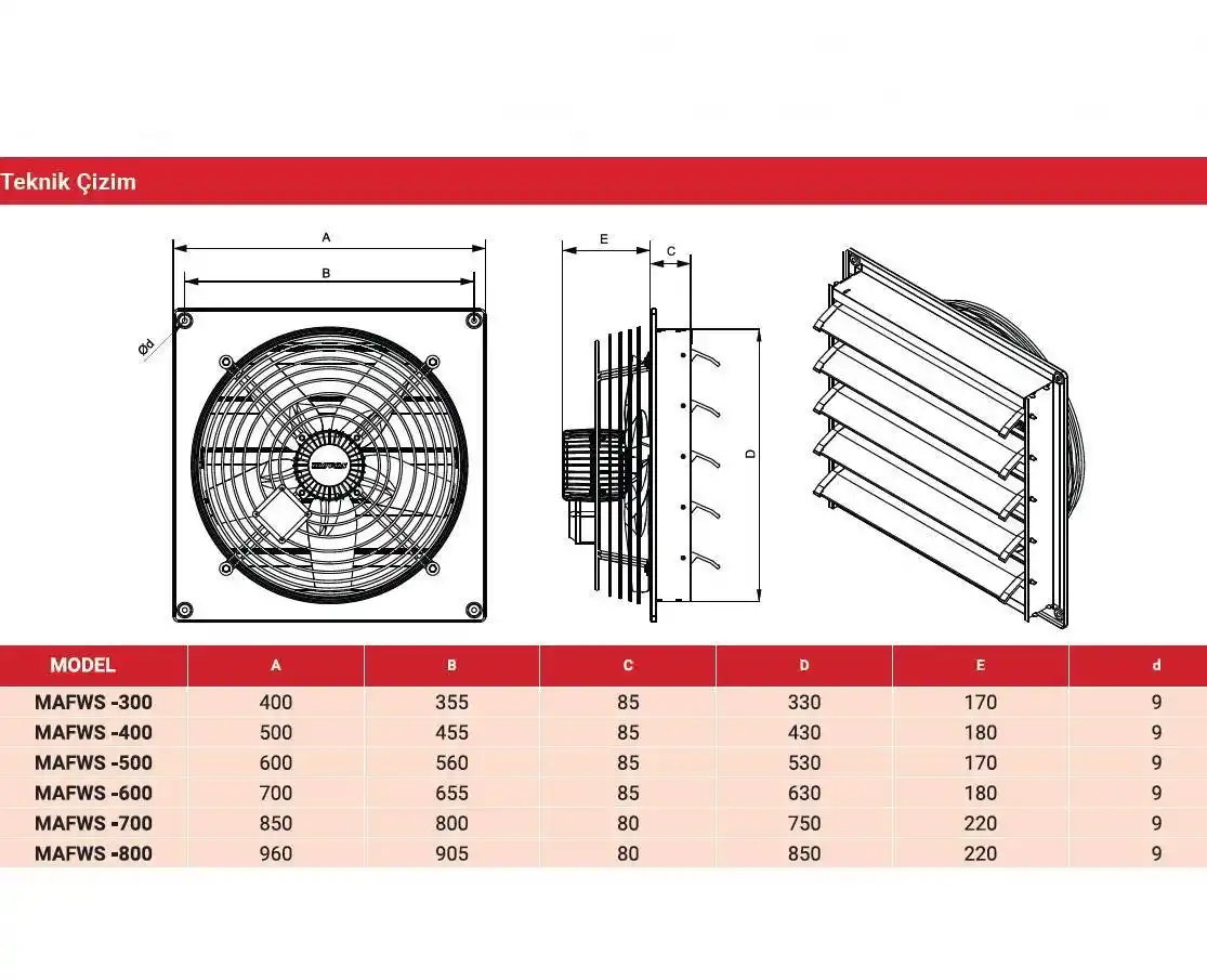 Kasa ve Pervane Yapısı: Kasa ve pervane, yüksek dayanıklılığa sahip DKP sac metalden üretilmiştir ve elektrostatik toz boyama yöntemiyle korozyona karşı korunmaktadır.