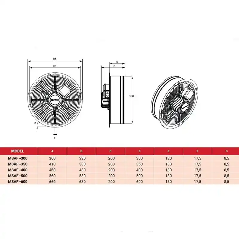 Movas MSAF serisi endüstriyel yuvarlak aksiyal fanlar, duvara veya metal/ahşap plakaya kolayca monte edilebilecek şekilde tasarlanmıştır. Her çap için farklı boyut seçenekleri sunulur.