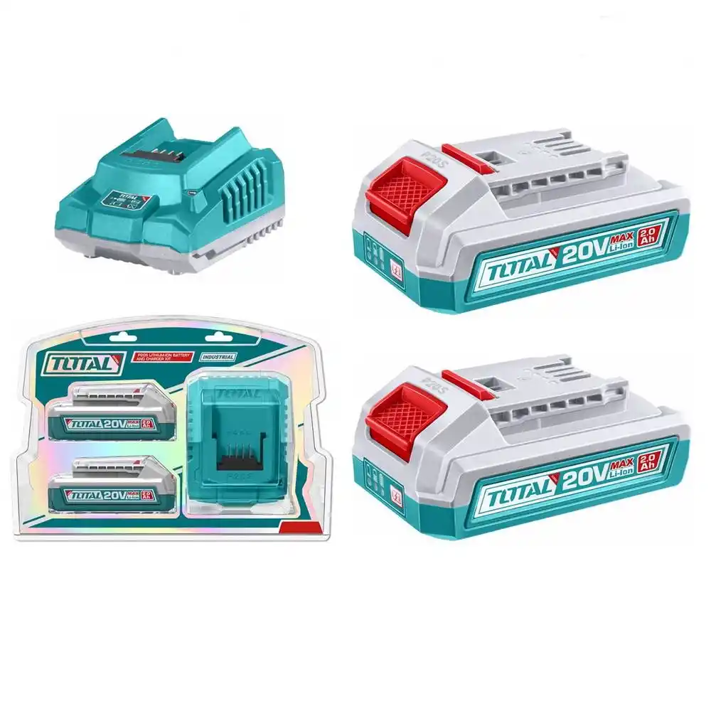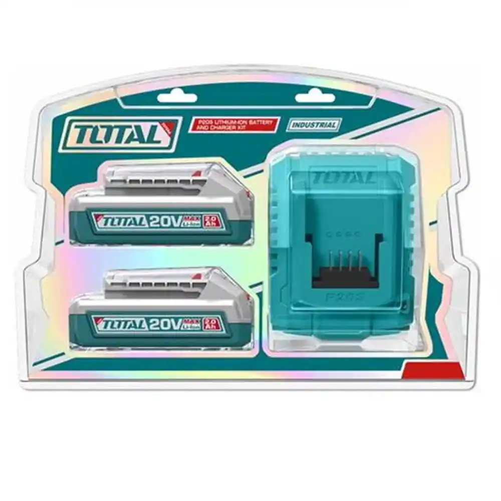 Total TFBCPK2212E P20S set; 2 adet 20V 2.0Ah Li-ion akü ve hızlı şarj cihazı ile kablosuz el aletlerinizde kesintisiz güç ve tam uyumluluk sunar.
