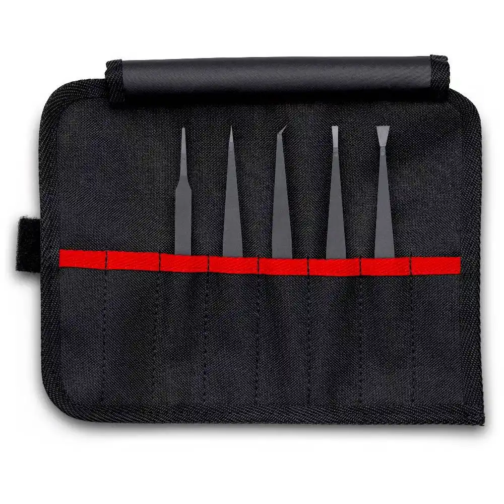 Knipex 92 00 05 ESD, hassas elektronik bileşenleri ve statik elektriğe duyarlı parçaları güvenle taşımak için karbon fiber takviyeli plastikten üretilmiş, 5 farklı uç tipinden oluşan profesyonel bir settir.