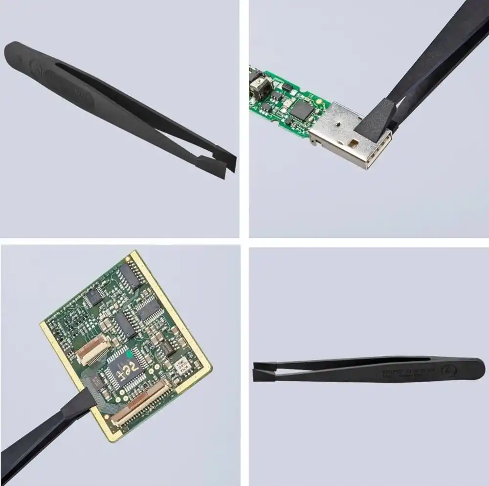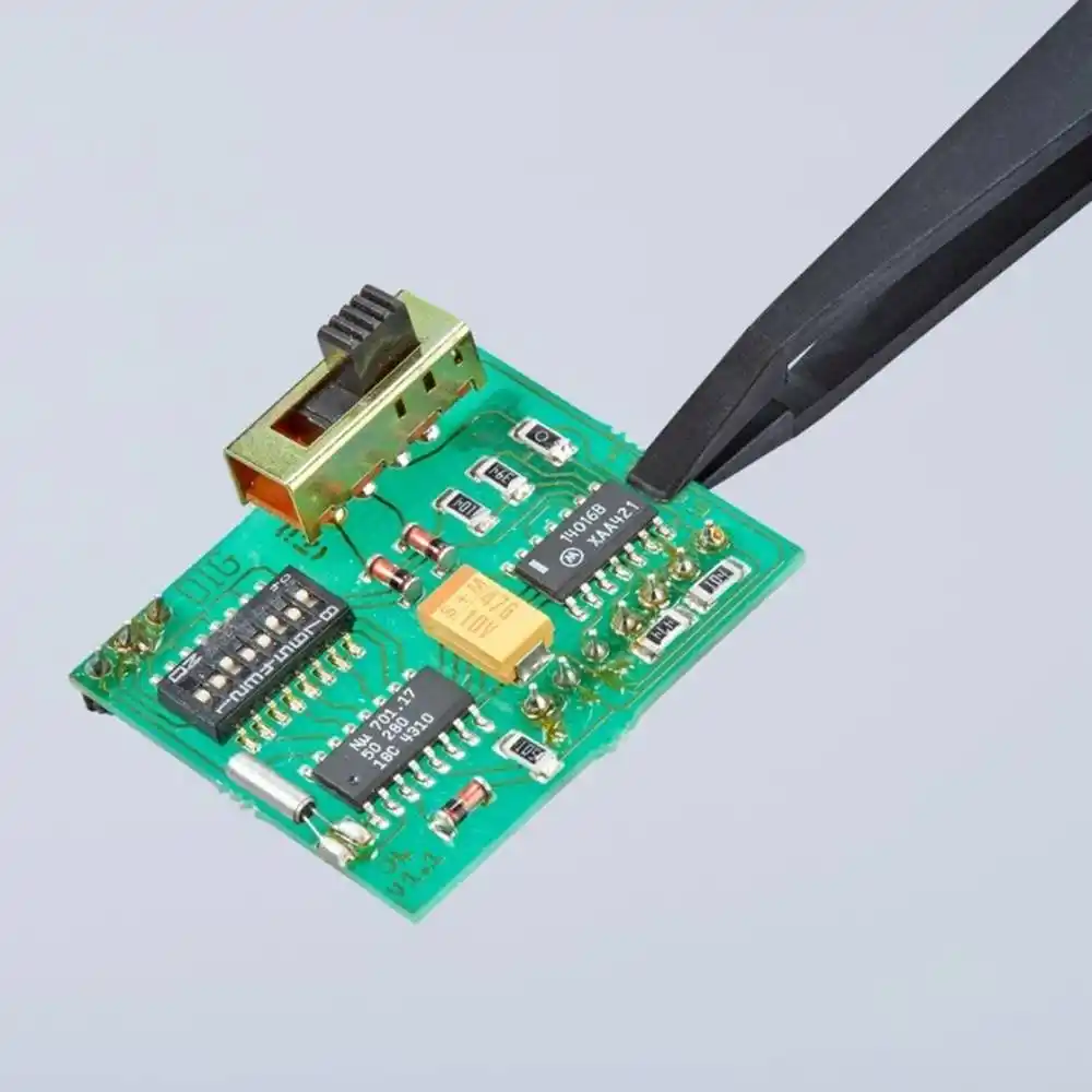 Knipex 92 00 05 ESD, metal cımbızların aksine bileşenlerde çizik bırakmaz ve %100 antimanyetik yapısıyla manyetik alanlardan etkilenen sensörlerin kalibrasyonunu bozmaz.