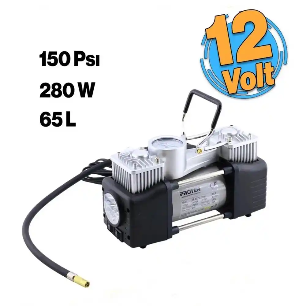 Proter PR 265 P2 çift pistonlu araç kompresörü, 12V güç kaynağıyla ve 150 PSI basınç kapasitesi ile araç lastiklerini kolayca şişirmenizi sağlar. Hem profesyonel kullanım hem de günlük ihtiyaçlar için ideal bir seçenektir.