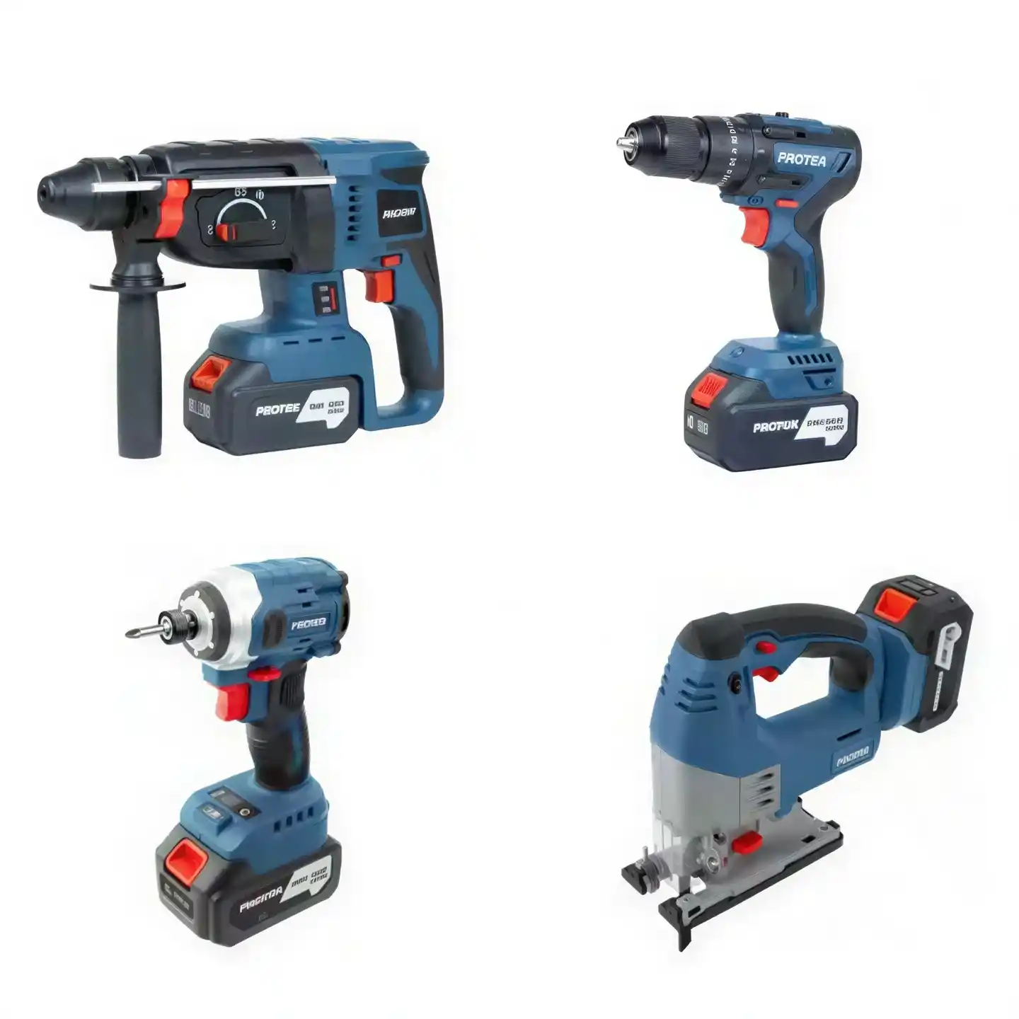 Proter PST 1914 Quatro, modern yapı, montaj ve dekorasyon işlerinde en çok ihtiyaç duyulan dört ana makineyi bir araya getiren profesyonel bir akülü kombine setidir. Set; beton delme ve hafif kırma işleri için bir kırıcı delici, metal kesme ve taşlama için bir avuç taşlama, montaj işleri için bir darbeli matkap ve hassas ahşap/metal kesimleri için bir dekupaj testereden oluşur.