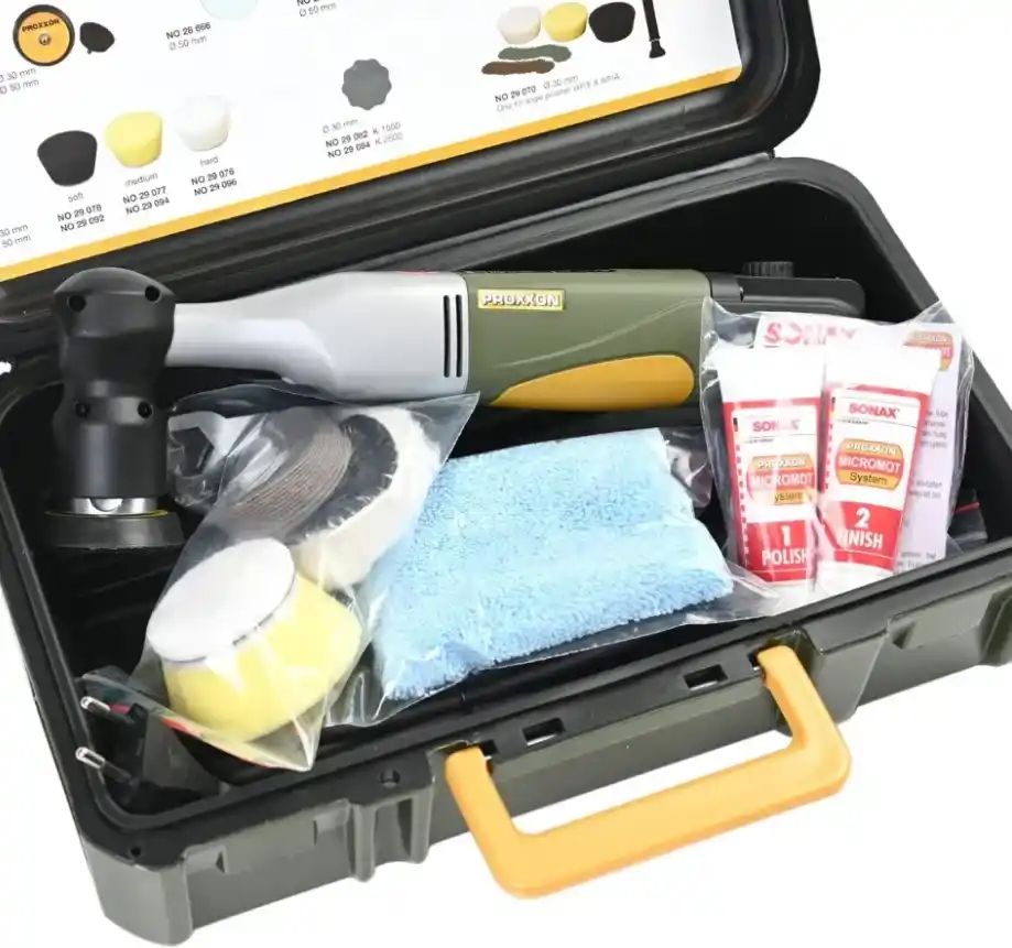 Teslimat kapsamı: Cırt cırtlı hızlı açma bağlantı elemanına sahip 50 mm çaplı köpük destek pedi, orta boy parlatma süngeri, kuzu yünü parlatma başlığı, metaller ve demir dışı metaller için orta sertlikte parlatma keçe diski, 12 K2000 zımpara diski, boya hazırlığı için iki aşamalı Sonax parlatma emülsiyonu (2 x 25 ml), mikrofiber bez, alet değiştirme anahtarı
