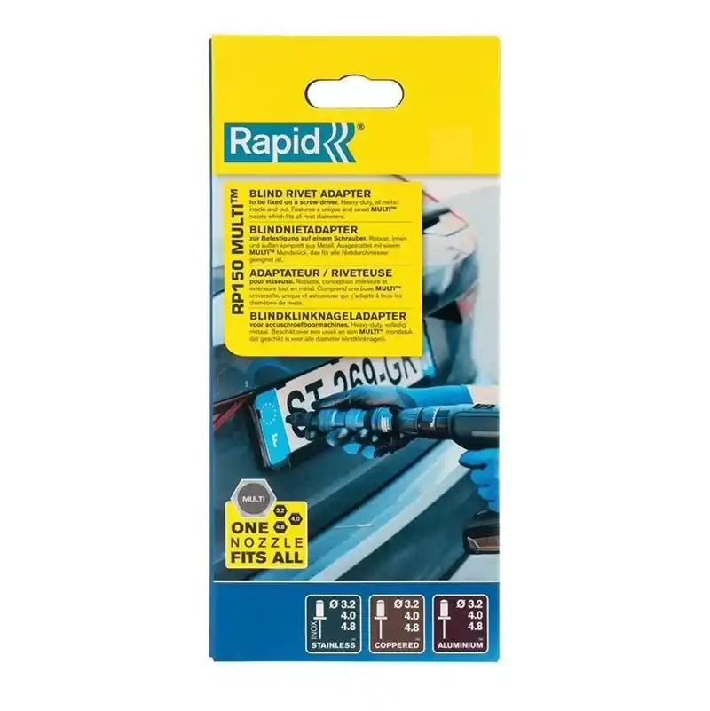 Bu perçin makinesi, Ø3.2 - Ø4.0 - Ø4.8 mm perçinleri benzersiz bir nozul ile ayarlamanıza izin veren Multi™ nozul ile donatılmıştır. Rapid RP150 Multi, daha karmaşık perçinleme aletlerine şık ve güçlü bir alternatiftir.