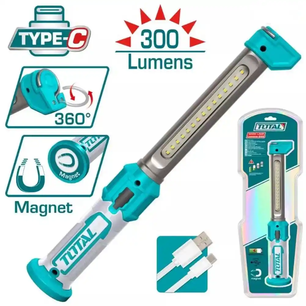 Total TWLI043006, 4V lityum-iyon batarya ile çalışan, üzerinde bulunan güçlü mıknatısı ve askı kancası sayesinde karanlık çalışma ortamlarını eller serbest şekilde aydınlatan taşınabilir bir LED sistemidir.