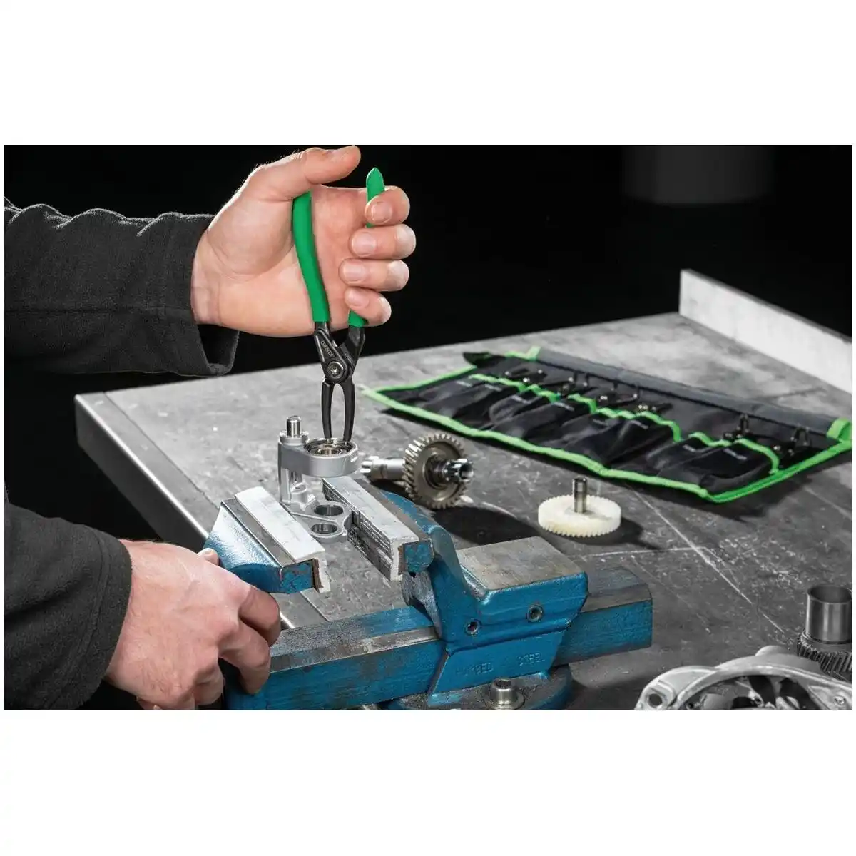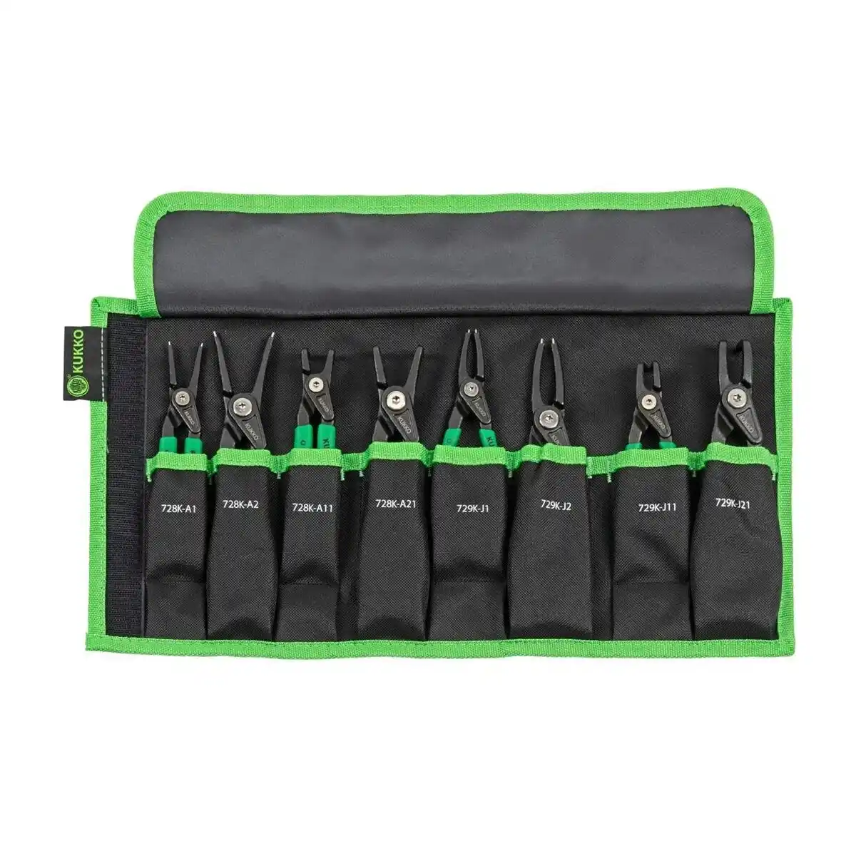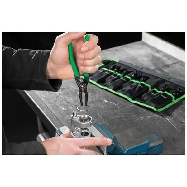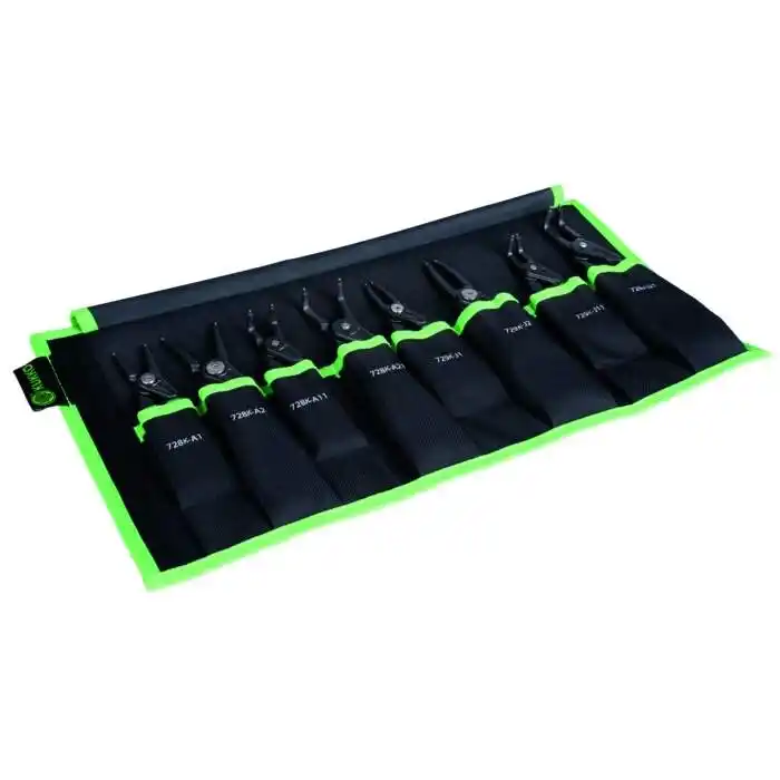 8 parçalı tutma halkası pense seti, el sanatları, endüstri ve atölyelerde şaftlardaki ve deliklerdeki tutma halkalarının montajı ve demontajı için kullanılır. Çeşitli tutma halkası penselerinin sade ancak güçlü dövme şekli, her türlü uygulama durumunda güvenli ve hızlı çalışma sağlar. Tutma halkasının çapına ve konumuna bağlı olarak, set çeşitli boyut ve şekillerden oluşur ve kullanıcının duruma göre çalışmasına olanak tanır.