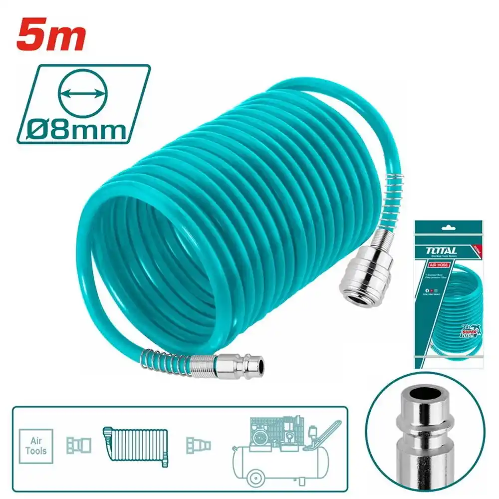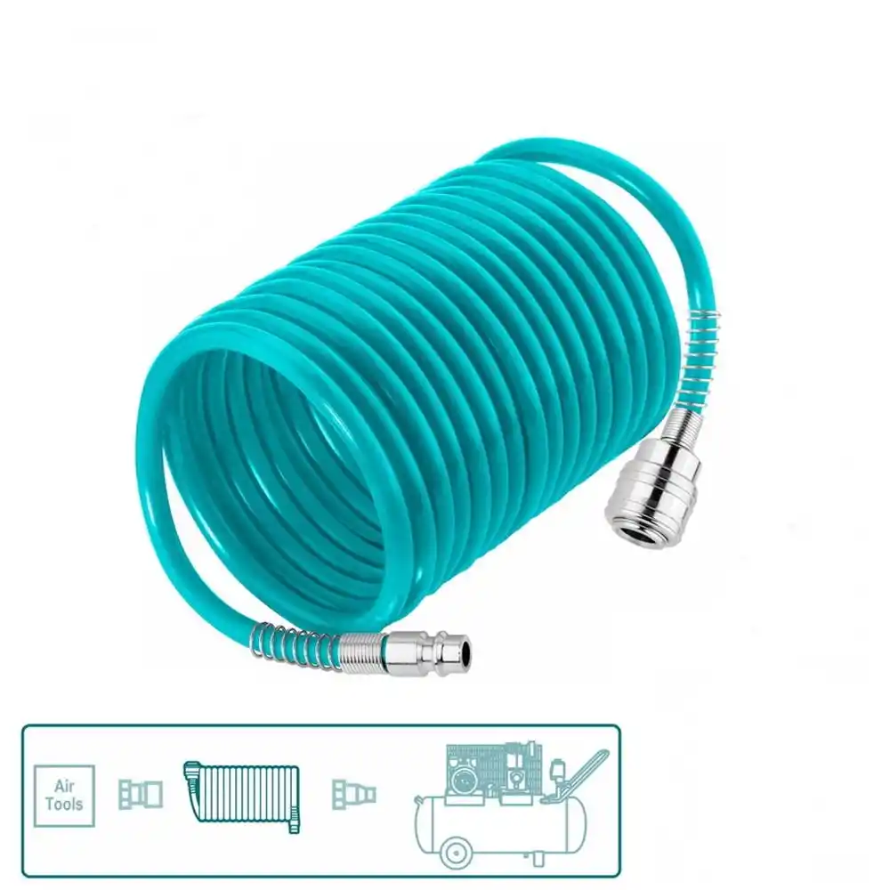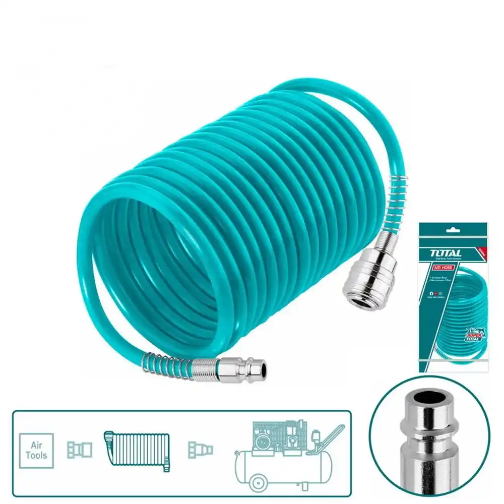Total HT11051, hava kompresörü ile havalı el aletleri (tabanca, çivi çakma, şişirme aparatları vb.) arasındaki bağlantıyı sağlayan, spiral (yaylı) formda tasarlanmış profesyonel bir hava hortumudur. 5 metre uzunluğa sahip olan bu hortum, poliüretan malzemesi sayesinde bükülmelere, kırılmalara ve aşınmaya karşı son derece dirençlidir.